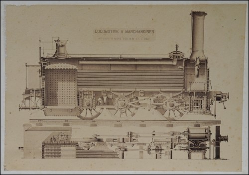 Elévation d'une Locomotive vapeur à Marchandises de 1862 par André Koechlin constructeur et C. Schivre ingénieur civil, photographie G. Dardel, Mulhouse. Dimensions de la photographie: hauteur 17,2 cm, largeur 24.5 cm; format 29,5 cm x 36,7 cm.