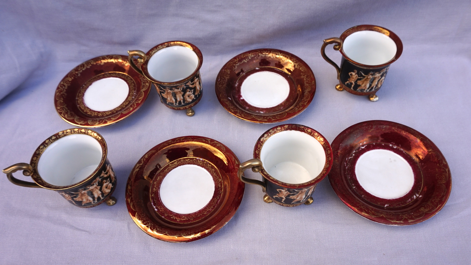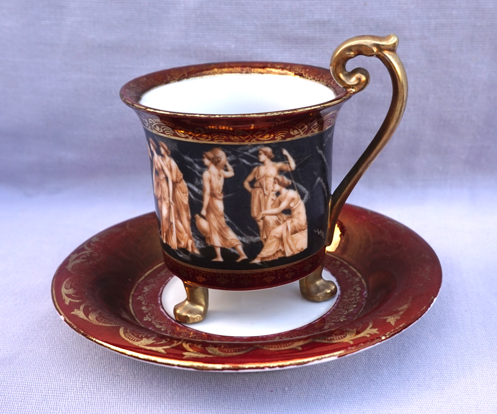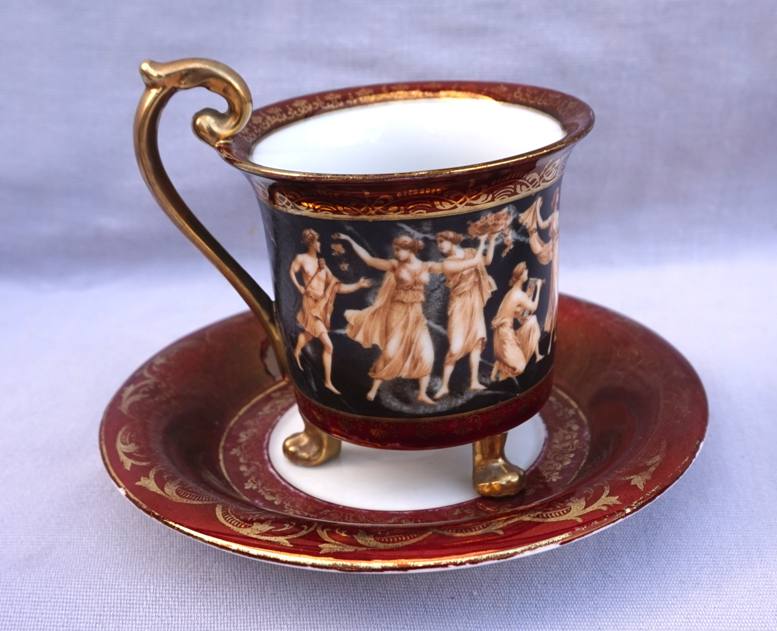 German porcelain set of 4 cups and saucers showing mythical scene made by Erdmann Schlegelmilch in Thuringia during the middle of the 19th century. All the pieces are stamped with the E Schlegelmilch mark and one with the painter mark. They measure for the cup 4" (10.2cm) height, 4" (10.2cm) width with handle, 33/8" (8.5cm) diameter; for the saucers 6" (15.2cm) diameter. Perfect condition