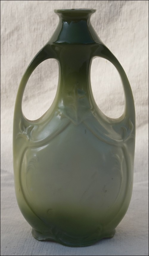 Flacon en porcelaine de Bohême Art Nouveau, vers 1900. Il est décoré par transfert. Numéro moule sur son fond. Bel état, une égrenure au pied, le bouchon de liège est à l'intérieur. Hauteur 16,5 cm, largeur 8,5 cm, épaisseur 5,5 cm.