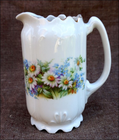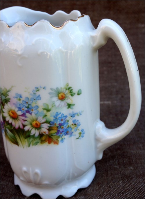 Art Nouveau flowered milk pot in porcelain showing daisy and forget me not made in Germany during the 1900's. Perfect condition. 4 7/8" high 4 3/8" width 2 5/8" diameter.