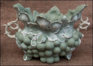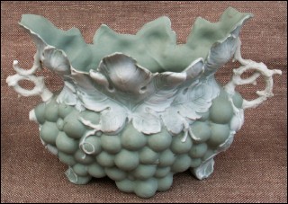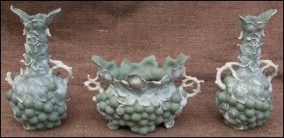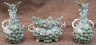Garniture of vases and jardiniere in german bisque "paste on paste" made by Schafer and Vater in Volkstedt Rudolstadt germany during the 1890's. Not in perfect condition a few parts missing as you can see on the pictures below. The vases numbered 1749 and the jardiniere 1753 are stamped with the manufacture mark. 7 1/2" high for the vases and 6 3/4" width for the jardiniere.