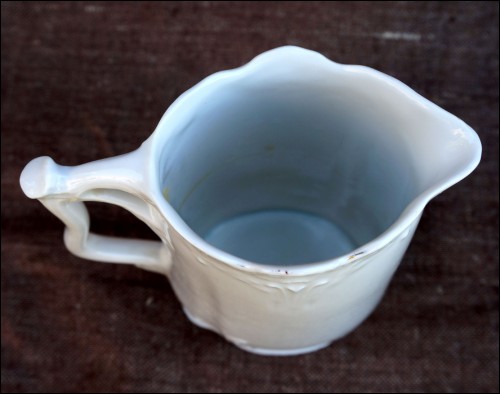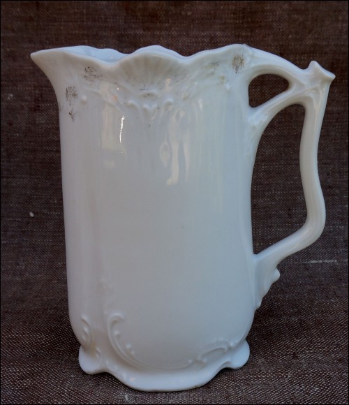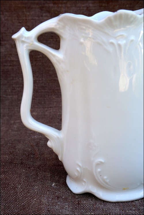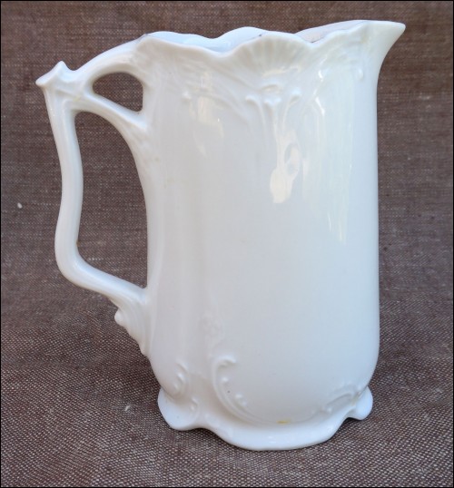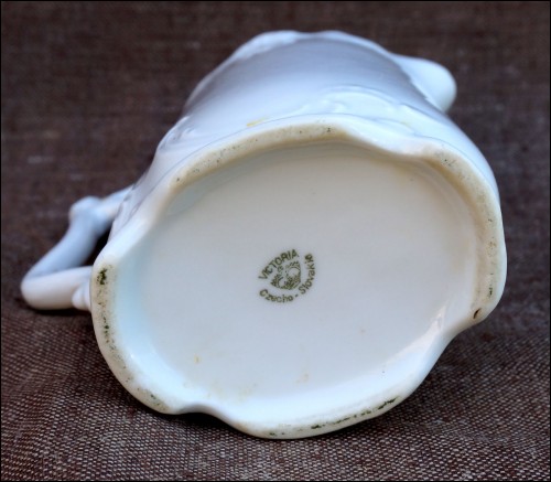 Art Nouveau milk pot in porcelain with garland in relief made in Czechoslovakia during the 1900's. Perfect condition. It's signed on the bottom. 5 3/8" high 5 1/4" width 2 3/8" depth.