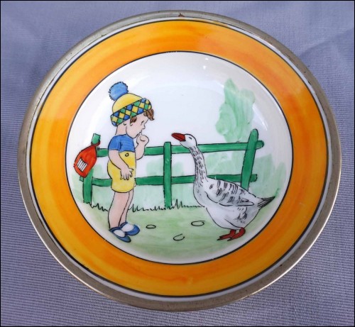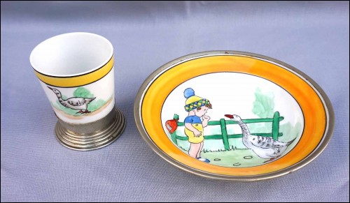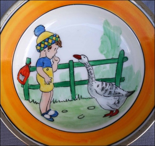 French baby or kid set including plate and cuop, in transferware porcelain with silverplated border, showing kid in garden with goose made in Limoges during the mid-century. They are signed on the back. 6 1/4" (15.7cm) diameter and 1 1/4" (3.2cm) height for the plate and for the cup 2 1/2" (6.3cm) diameter to the base. Perfect condition as shown by the following pictures.