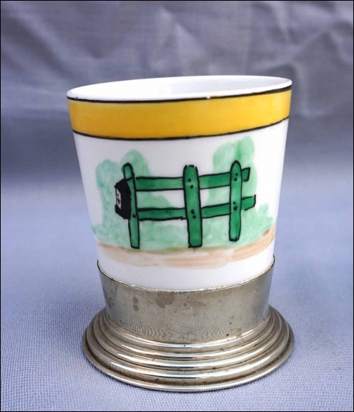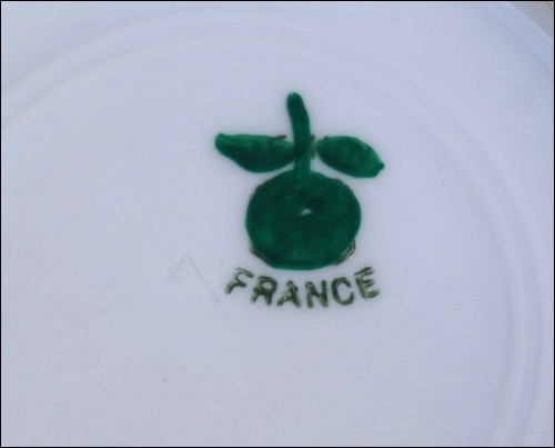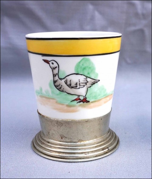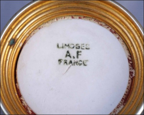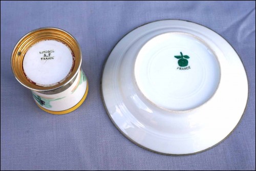 Timbale et assiette soucoupe pour enfant en porcelaine à décor de transfert cerclée, Limoges vers 1950. Signés au dos. Dimension pour la timbale 6.3 cm, pour l'assiette diamètre 15.7 cm, hauteur 3.2cm. Bel état.