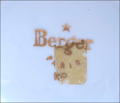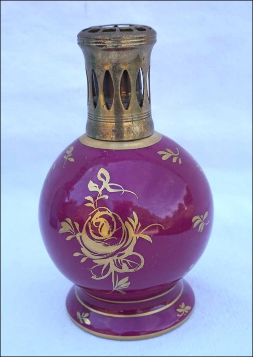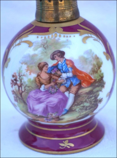 Lampe Berger en porcelaine de Paris à décor Fragonard. Signée sur son fond. Hauteur 15,5 cm, diamètre au corps 9,5 cm. Très bel état, manque la pierre du bruleur.