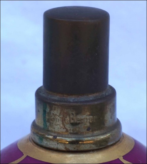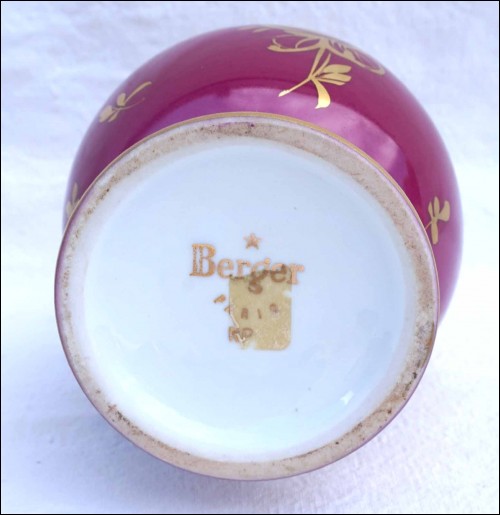 Original Berger lamp in gilt and transferware porcelain showing romantic scene from Fragonard made by Berger Paris. It's signed on the back. 6 1/8" (15.5cm) height, 3 1/2" (9.5cm) diameter. Perfect condition only the stone of the burner is missing as shown by the following pictures.