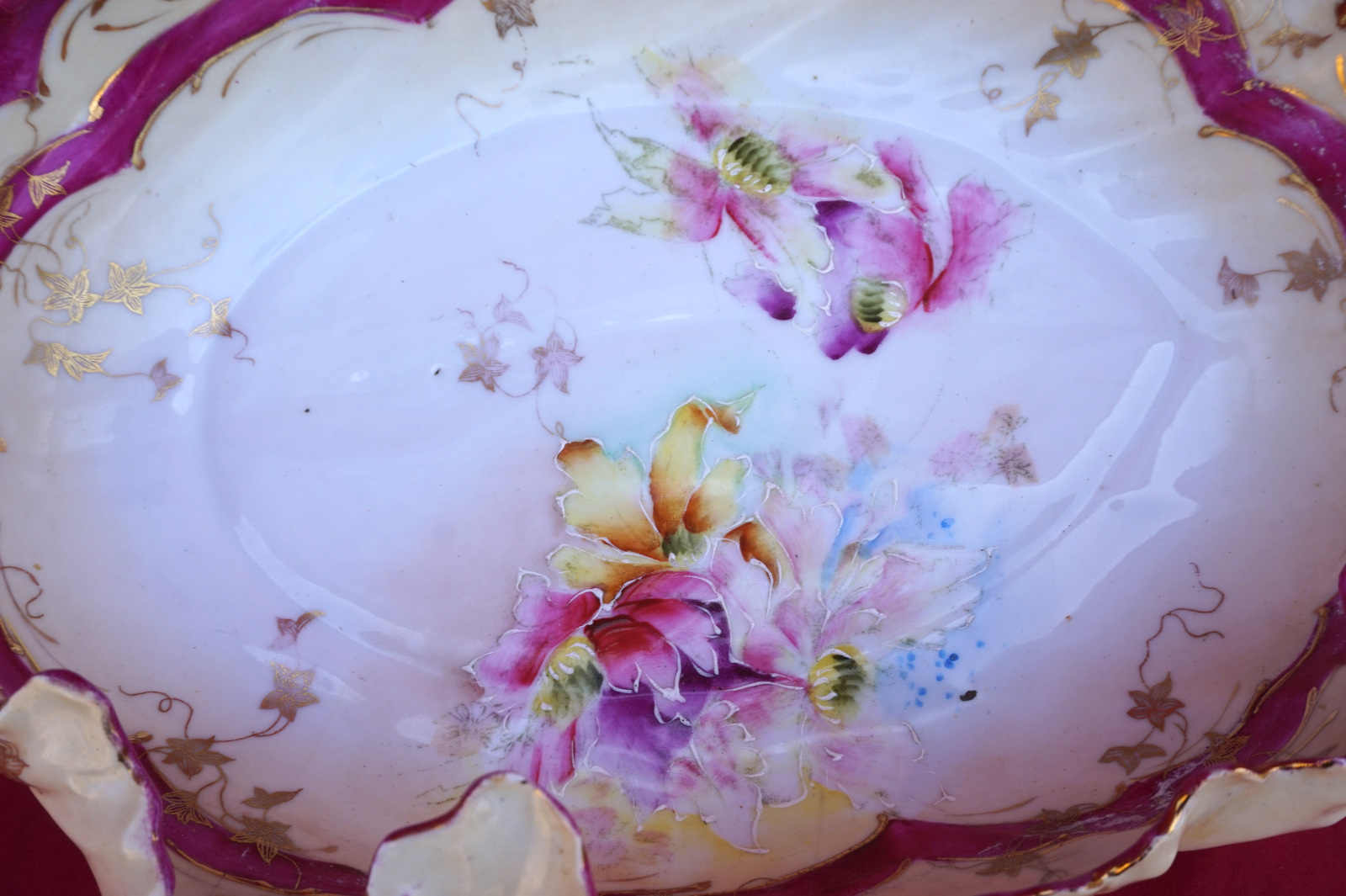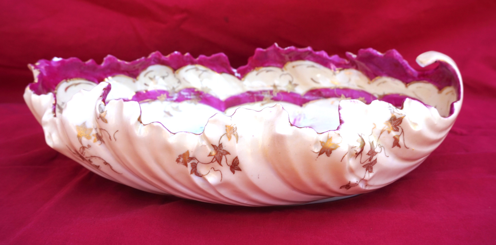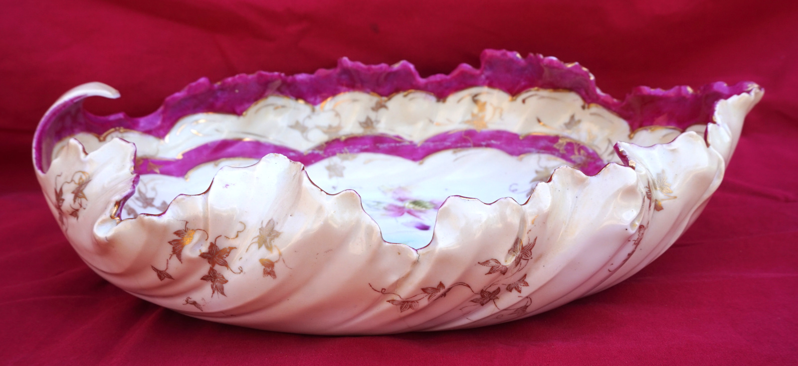 Grande coupe Art Deco en forme de feuille à décor de fleurs peintes à la main et réhaussé or, porcelaine deBohème, début XX° siècle. Longeur 31cm, largeur 22.2cm, hauteur 9cm, poids 717 gr. Bel état, une micro égrenure sur une feuille et l'anse rétrécie, voir photos.