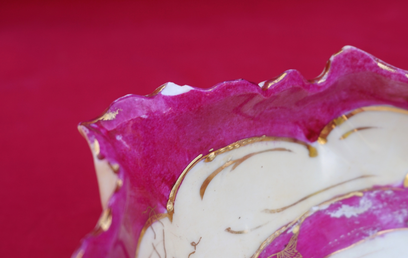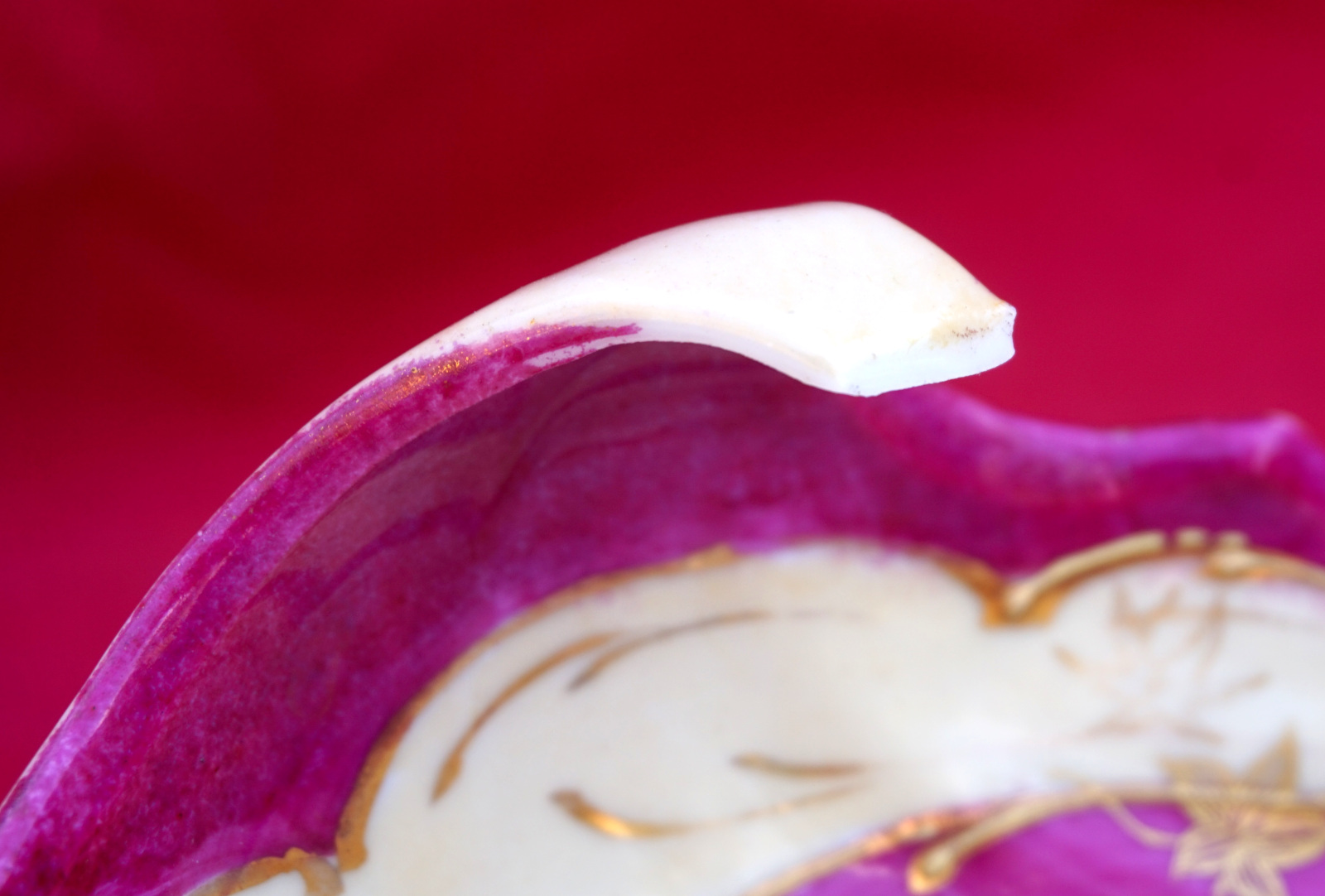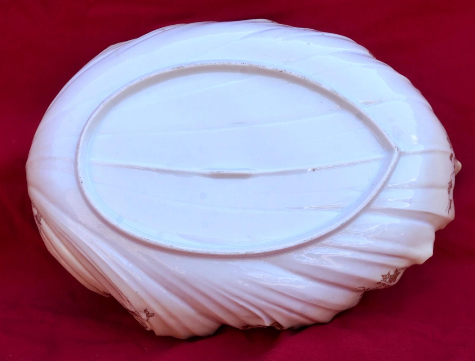 Grande coupe Art Deco en forme de feuille à décor de fleurs peintes à la main et réhaussé or, porcelaine deBohème, début XX° siècle. Longeur 31cm, largeur 22.2cm, hauteur 9cm, poids 717 gr. Bel état, une micro égrenure sur une feuille et l'anse rétrécie, voir photos.