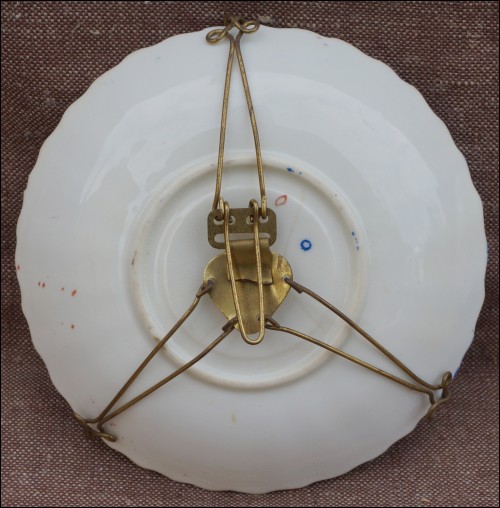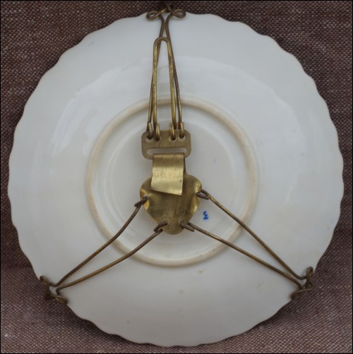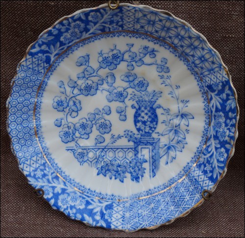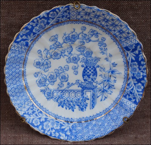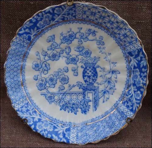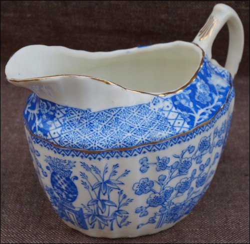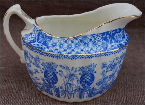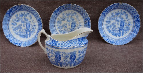 Creamer & 3 saucers Aesthetic transferware Chinese Vase pattern by Blair & Co circa 1884 and probably Staffordshire. The pattern is enhanced with gilt edges. Good condition for the set only one saucer has a lightly yellowish stains as you can see on the pictures below. 3 3/4" high and 5 1/2" width for the creamer and 5 1/2" diameter for the saucers.