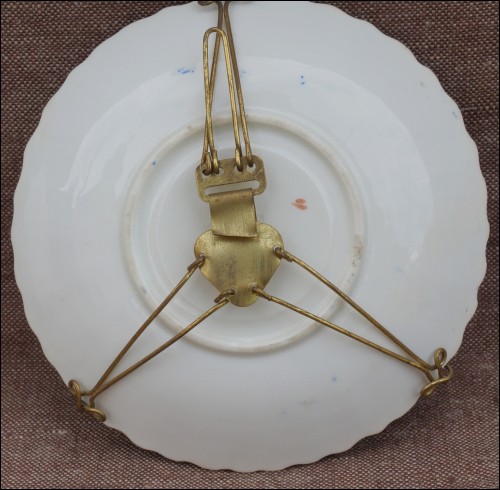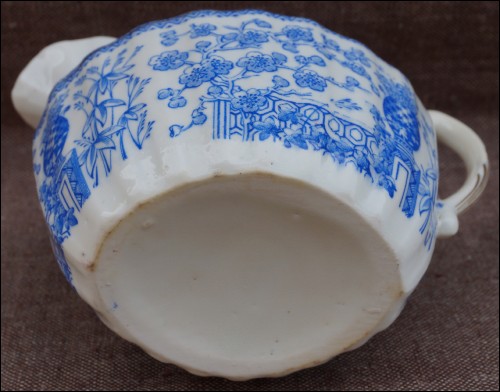 Pot à crème et ses trois sous tasse, porcelaine de Staffordshire, décor de Blair & Co, mouvement Aesthetic, vers 1884 .Scène de jardin asiatique et marli géométrique en bleu et blanc agrémenté de filets or. L'ensemble est en très bel état léger jauni sutout la sous tasse centrale. Pot à crème : hauteur 9,5 cm, longueur 14 cm, sous tasse 14 cm de diamètre.