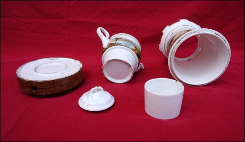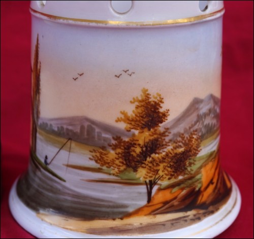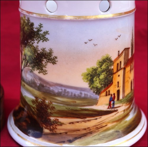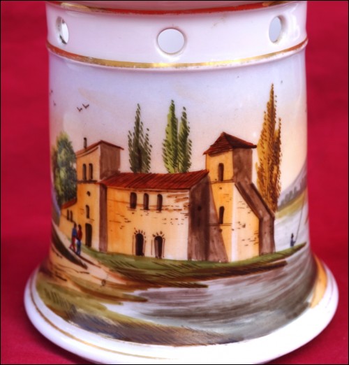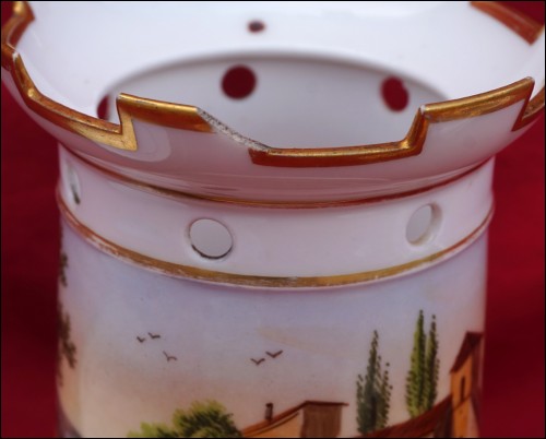 French Empire tisaniere herbal pot in hand painted porcelain showing Tuscany landscape Italy made during the 1820's. 8" (20.2cm) height, 4 3/8" (11.7cm) diameter to the base. Good condition a damage on tower niche and repair to the edge of the pot as shown by the following pictures.