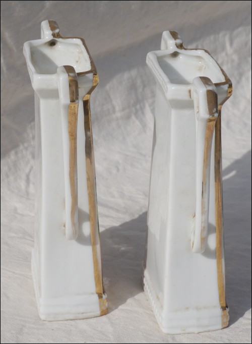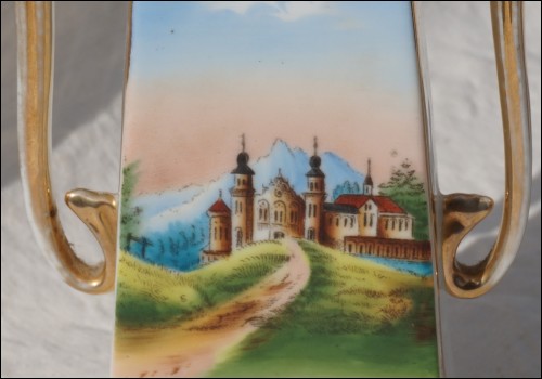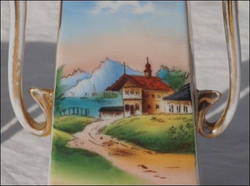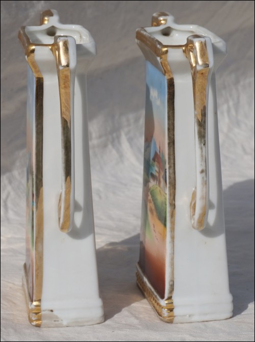 Jugendstil porcelain pair vases showing Bodensee religious buildings in transferware enhanced with gilt made during the 1900's. They are unsigned. 5 1/4" height 4" width 1 1/2" depth. Perfect condition as presented on the following pictures.