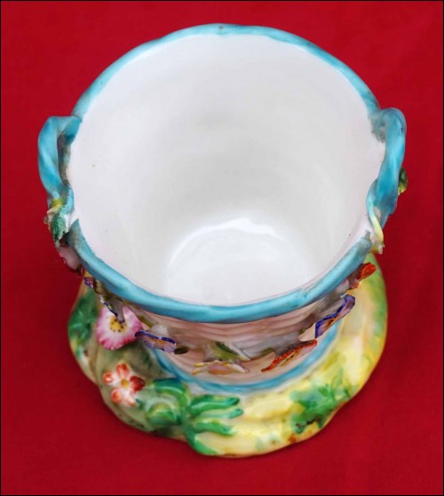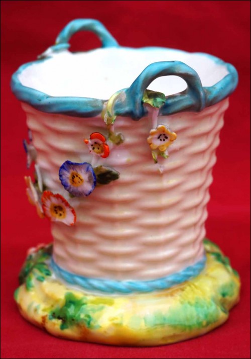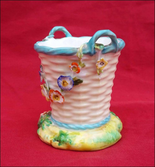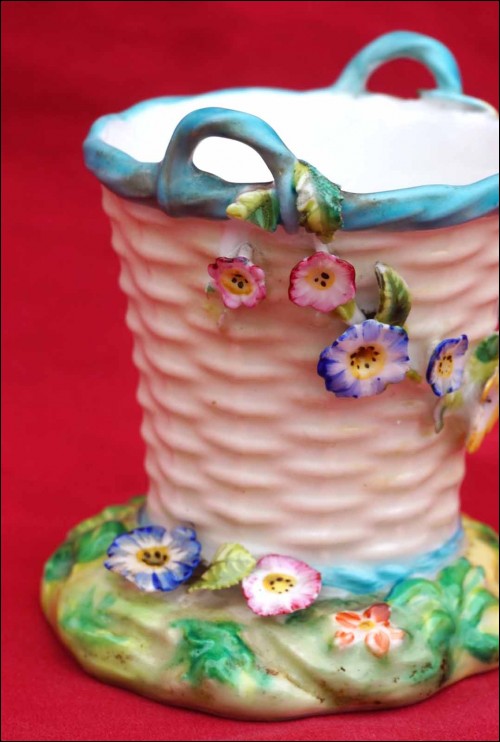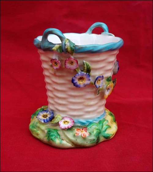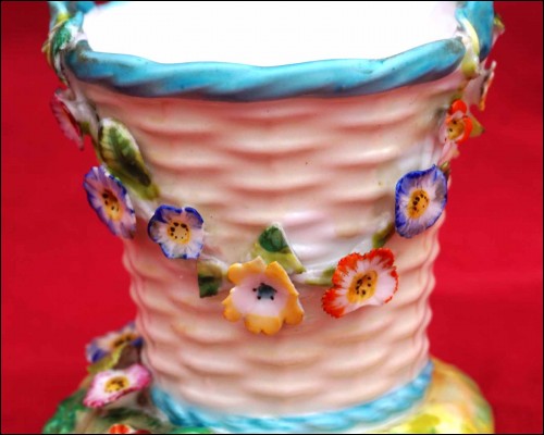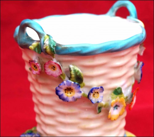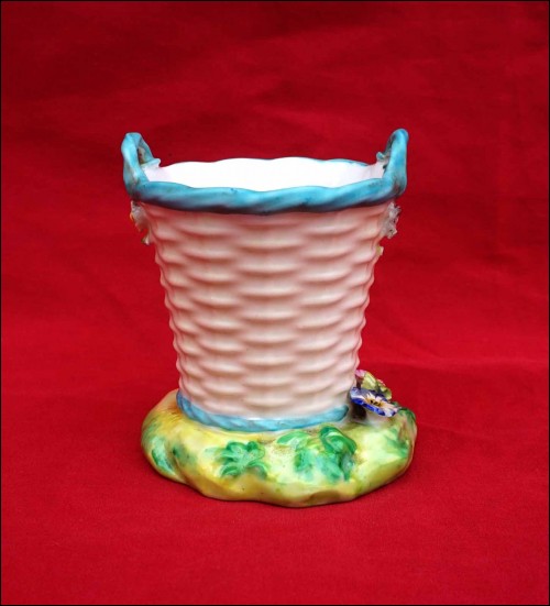 Antique basketwave flower pot or jardiniere in hand painted porcelain with flowers made in Germany during the second half of the 18th century. It's signed on the back. 3" (7.8cm) height, 2 3/4" (7cm) diameter. Beautiful condition a few small part of petal are missing as shown by the following pictures.
