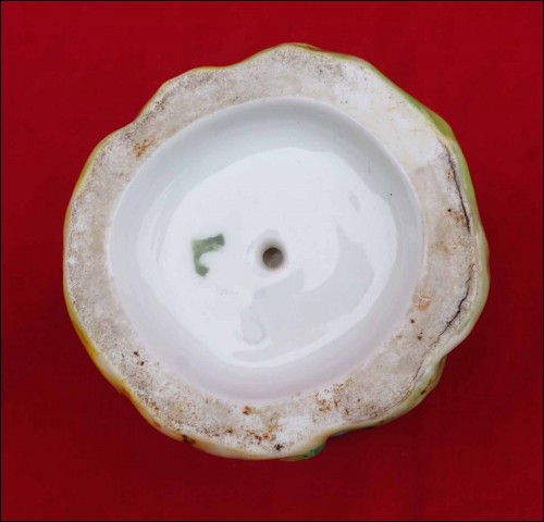 Petit cache pot en porcelaine allemande rehaussée d'un décor main , deuxième moitié du XVIII° siècle. Signature sur le fond. Hauteur 7.8 cm, diamètre 7 cm. Très bel état, quelques pétales abîmées.