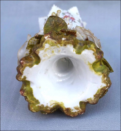German hand painted oprcelain with flowers in relief at the base bridal small vase made late 19th century. It's stamped on the back 709. 4 1/2" (11.5cm) height, 3 1/8" (8cm) base diameter. Good condition a few small part of leaves and flower petals missing as shown by the following pictures.