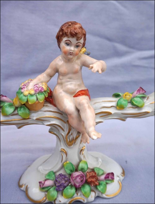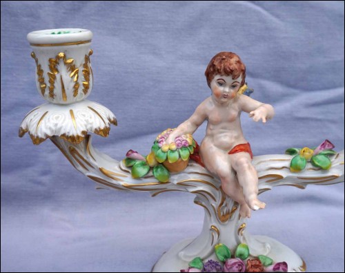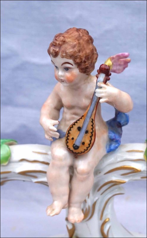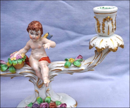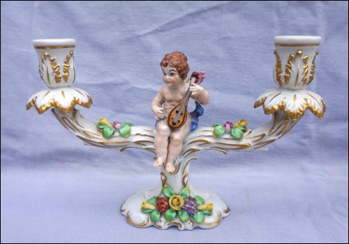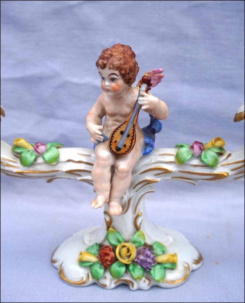German Porcelain Musician Putti Cherub Pair Candlestick