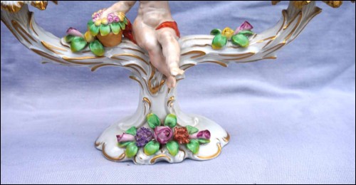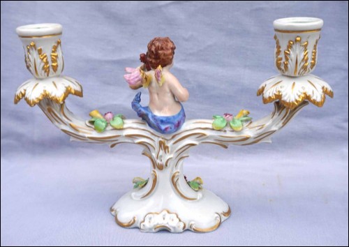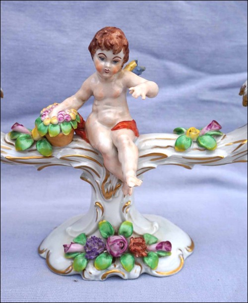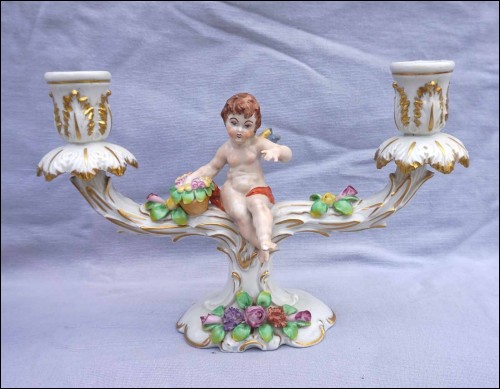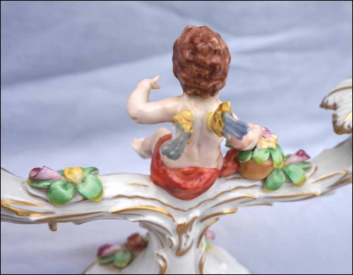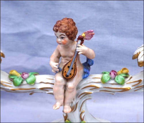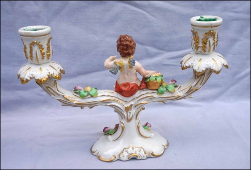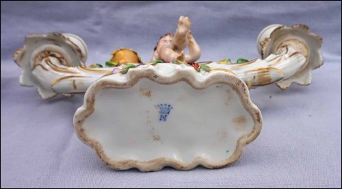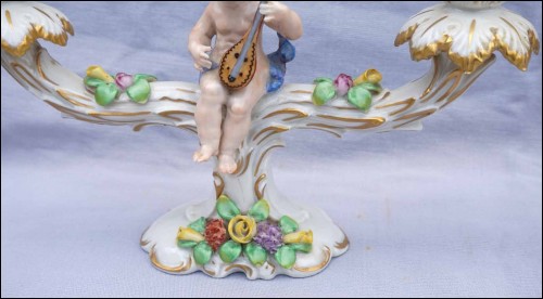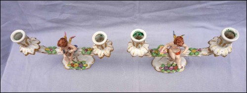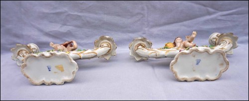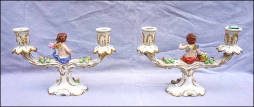 Paire de bougeoirs à 2 lumières à décor de chérubins en porcelaine Allemande, début XX° siècle. Ils sont signés sur leurs fonds. Largeur 25 cm, hauteur 16cm, profondeur 6.5 cm. Bel état, un éclat sur un pied du chérubin avec les fruits, manque deux doigts au musicien.