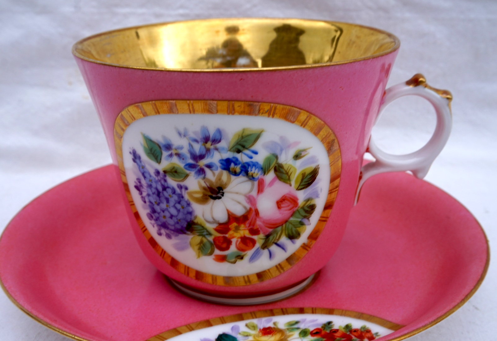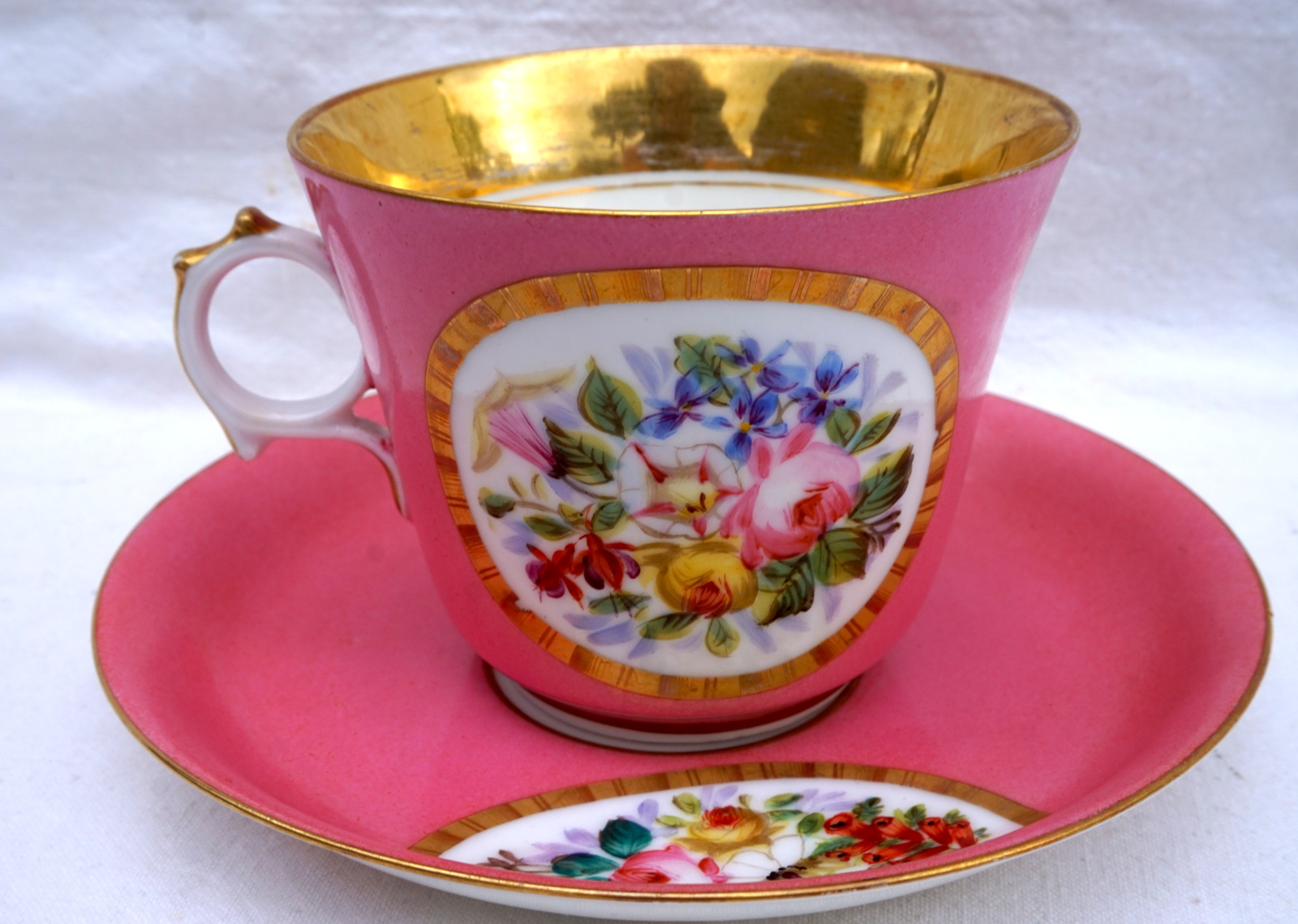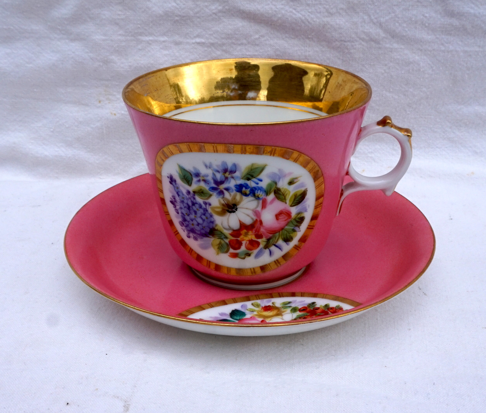 French gold and enamel handpainted porcelain tea cup and saucer showing bouquet of flowers in medallion made in Paris during the middle of the 19th century. They measure 3 3/4" (9.5cm) total height, for the cup 3/8" (8.5cm) height, 4" (10.2cm) diameter, 4 7/8" (12.3cm) width with the handle, for the saucer 6 1/2" (16.5cm) diameter. Perfect condition.