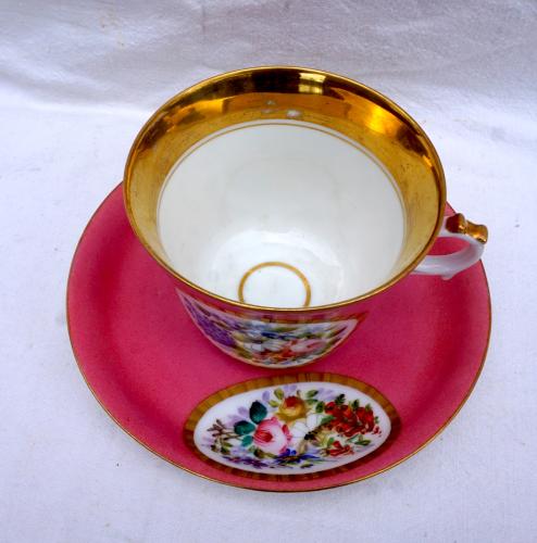 Gold Enamel Hand Painted Porcelain Tea Cup Saucer Flowers Paris Middle 19th C