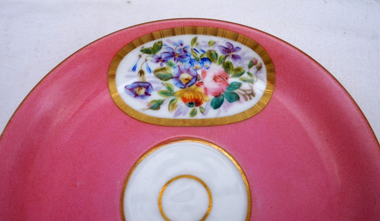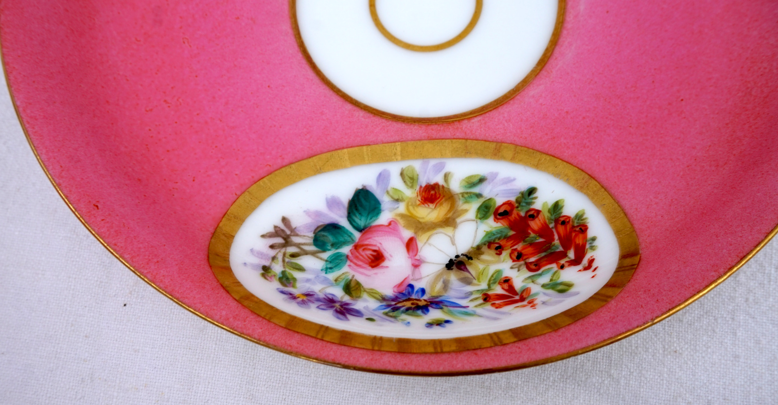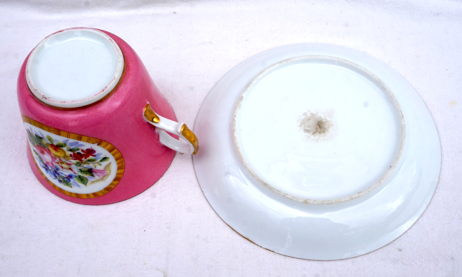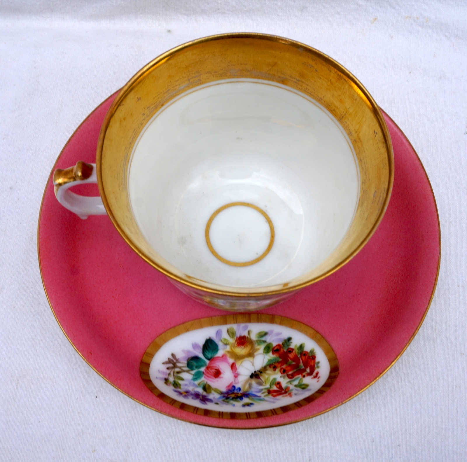 Tasse à déjeuner avec sa soucoupe en porcelaine peinte à la main de médaillons fleuris, Paris 1830. Hauteur totale 9.5 cm, pour la tasse: hauteur 8.5 cm, diamètre 10.2 cm, largeur avec l'anse 12.3 cm, pour la soucoupe 16.5 cm diamètre. Parfait état.