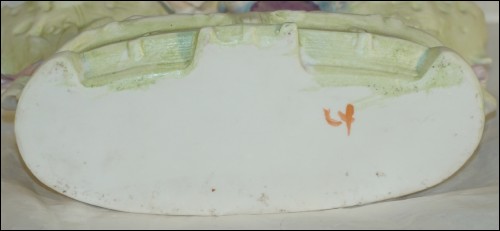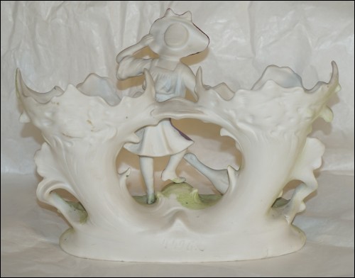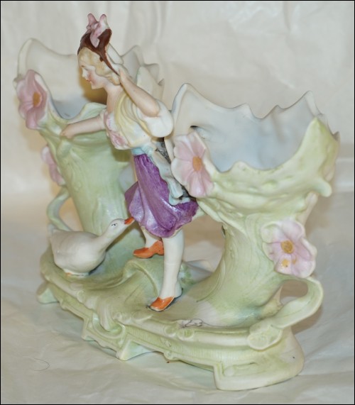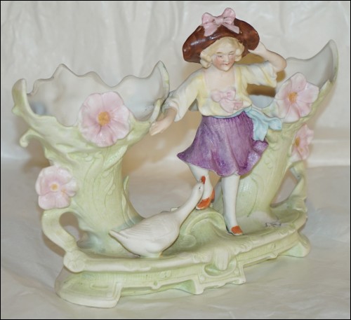 The guardian of geese jardiniere or planter in hand painted bisque porcelain made in Italy during the 1920's. It's numbered 4496for the mould and signed by the painter on the bottom. 7 1/4" width 5 1/2" height 2 1/8" depth. Good condition, one goose is missing and the thumb of the right hand is broken as presented on the folowing pictures.