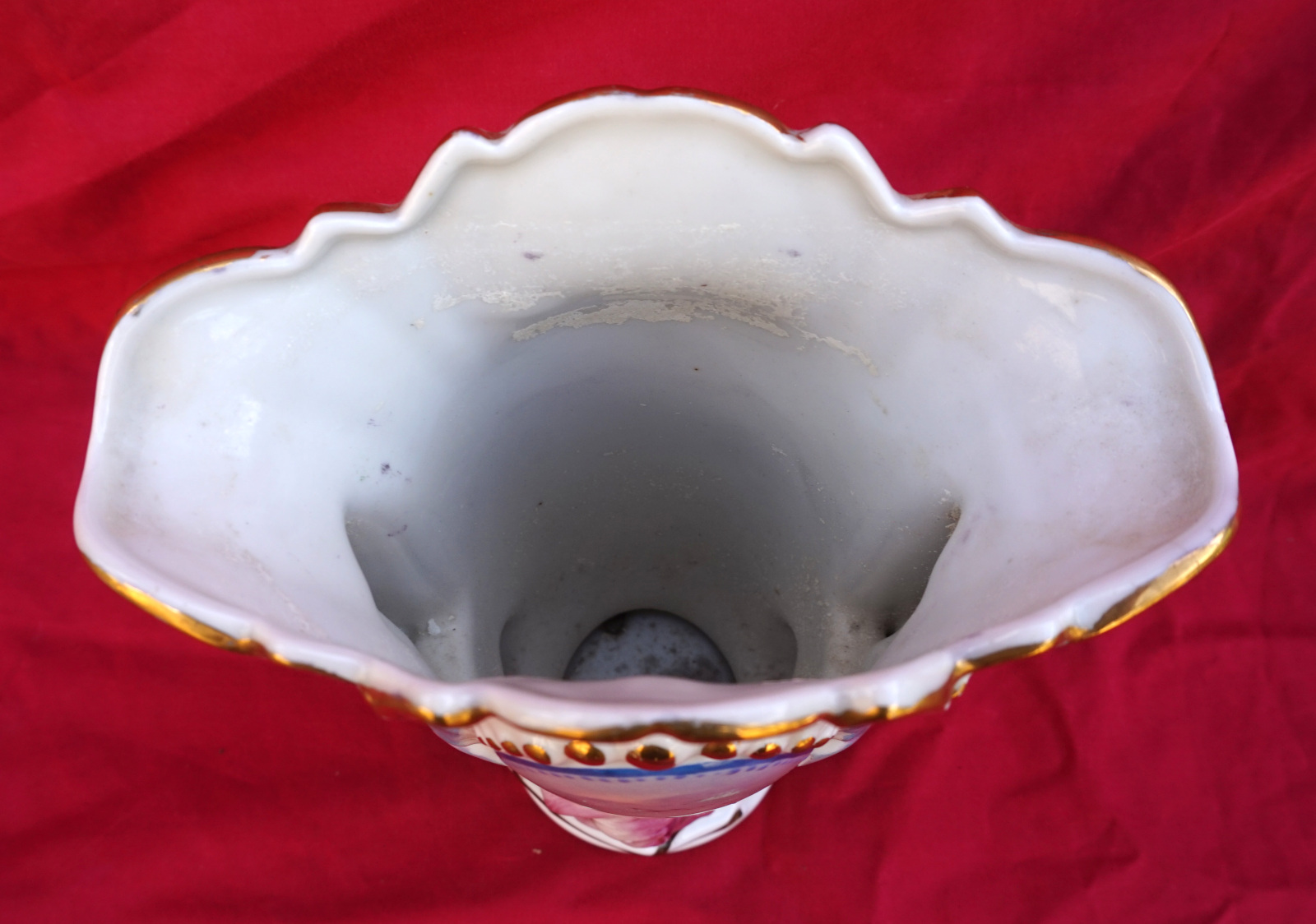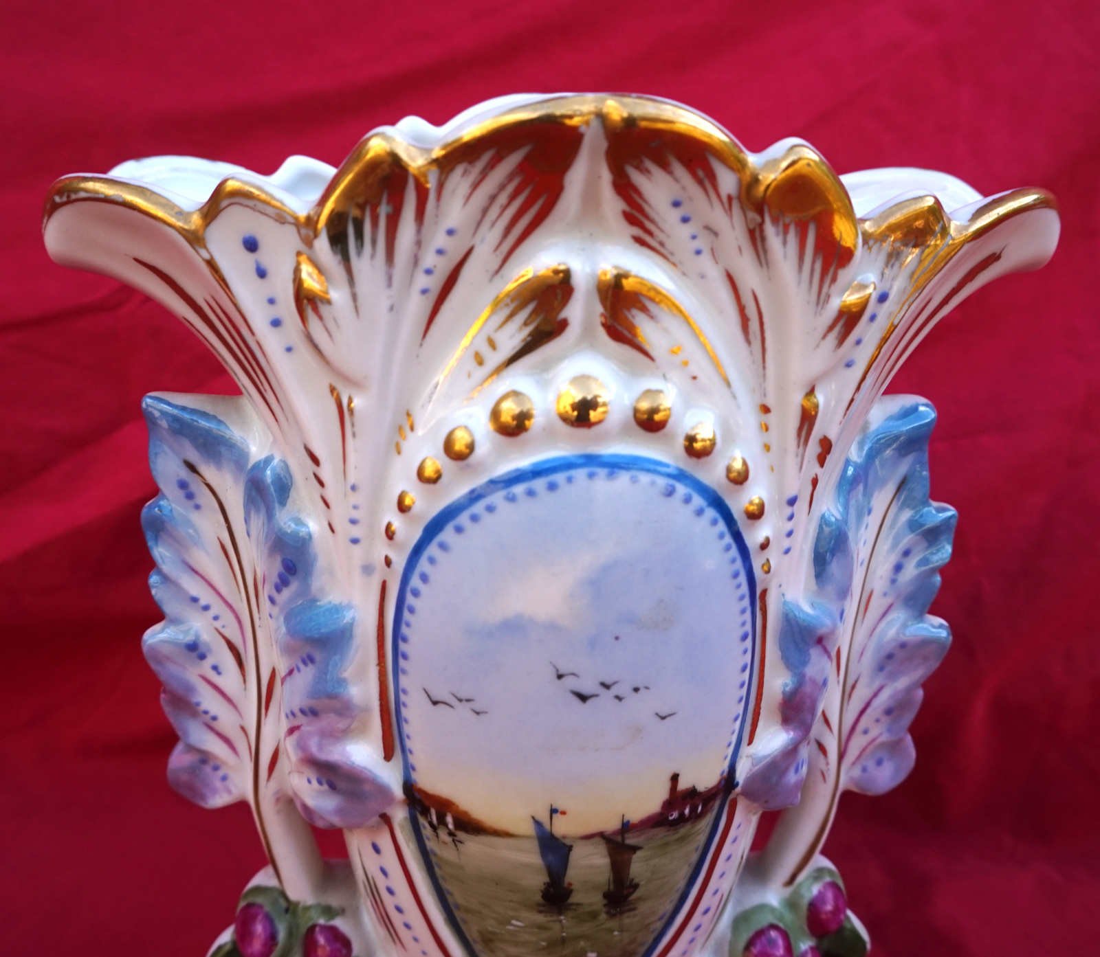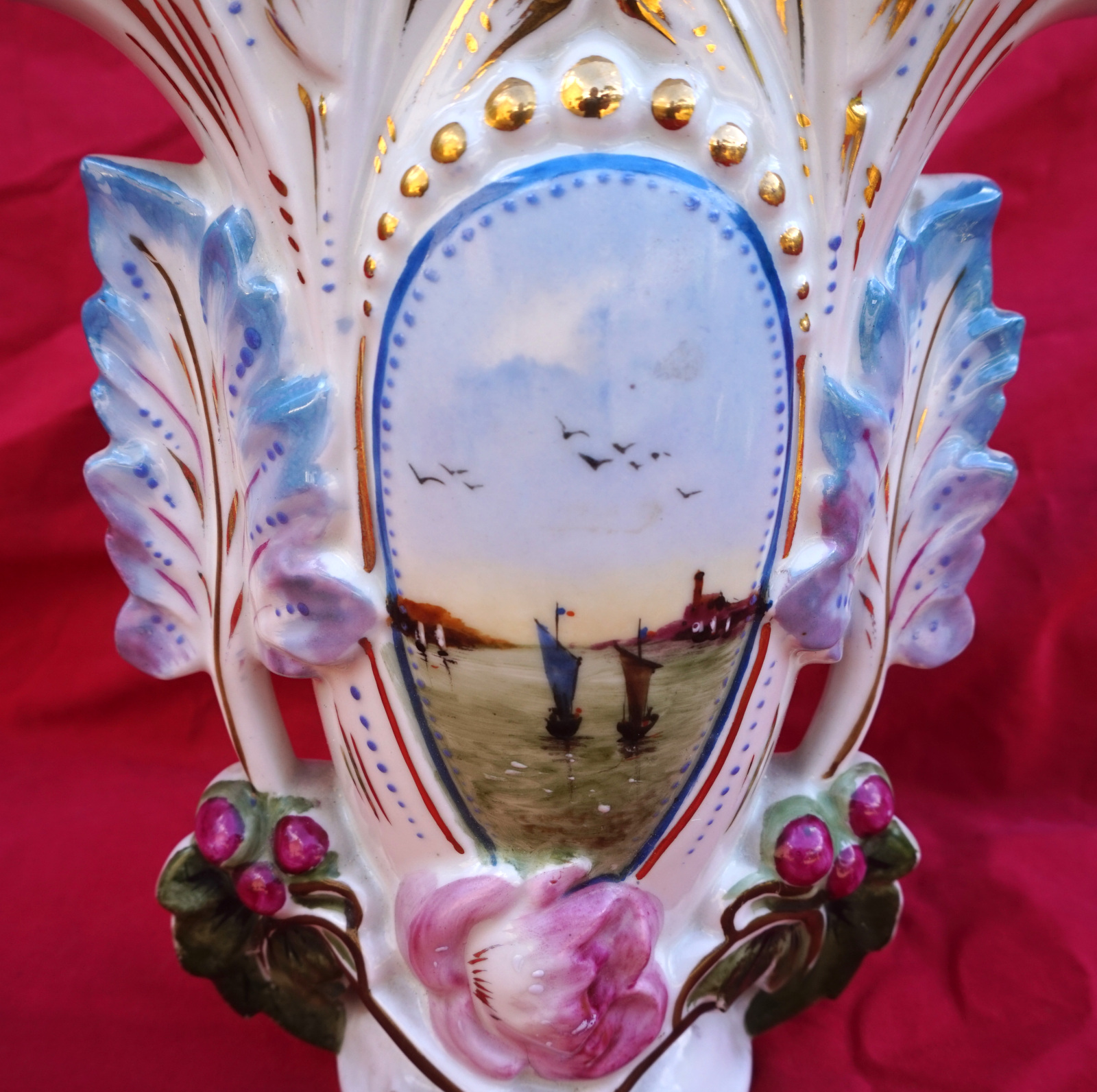 Vase de mariage en porcelaine de Paris peint à la main d'un décor de voilier en médaillon, fin XIXe siècle. Hauteur 21.5 cm, largeur 16 cm. Très bel état.