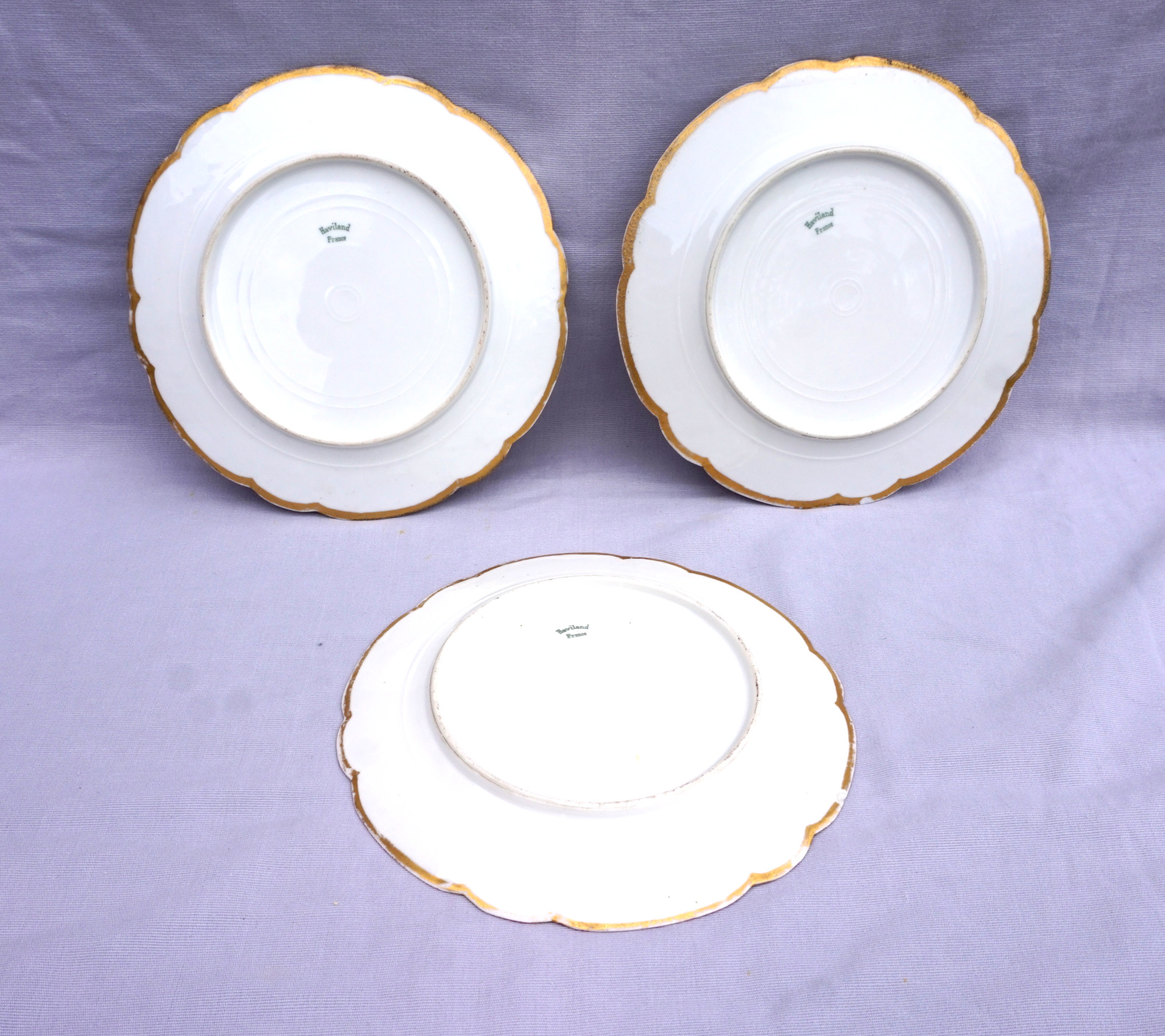 French hand painted and gilt porcelain set of 3 decorative plates made by Haviland Limoges during the 1900's. They are signed on the back. 9 1/2" (24.2cm) diameter. One in perfect condition the two other have a tiny chip on the back.
