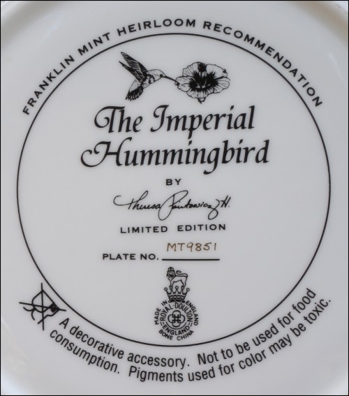 Porcelain floral plate Royal Doulton "The Imperial Hummingbird". Painted by Theresa Politowicz H limited edition number MT 9851. Franklin Mint Heirloom collectible plate. Good condition like-new, no chips, cracks. Measure 8 1/4? across.