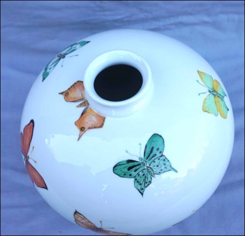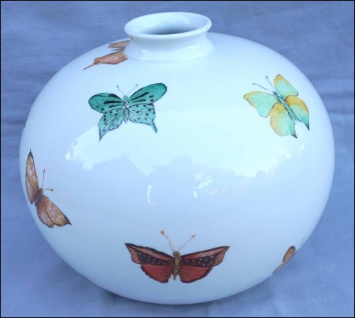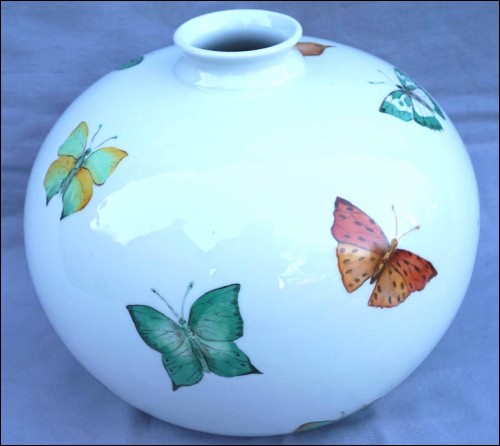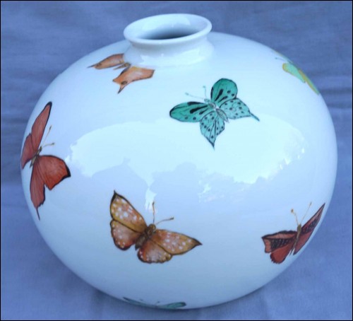 Grand vase boule aux papillons en porcelaine de La Seynie (ancienne manufacture de la Reine), fin du XXe siècle, décorée par transfert. Signé de la manufacture. Hauteur 22 cm, diamètre 28 cm, poids 2,880 kilogrammes. Très bel état.