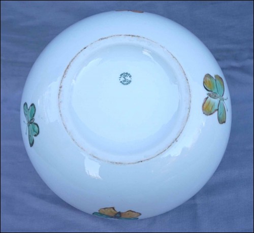 French transferware porcelain showing butterflies made by La Seynie in Limoges during the mid-century. It's signed on the back. 9" (23cm) height, 11" (28cm) body diameter. Perfect condition as shown by the following pictures.
