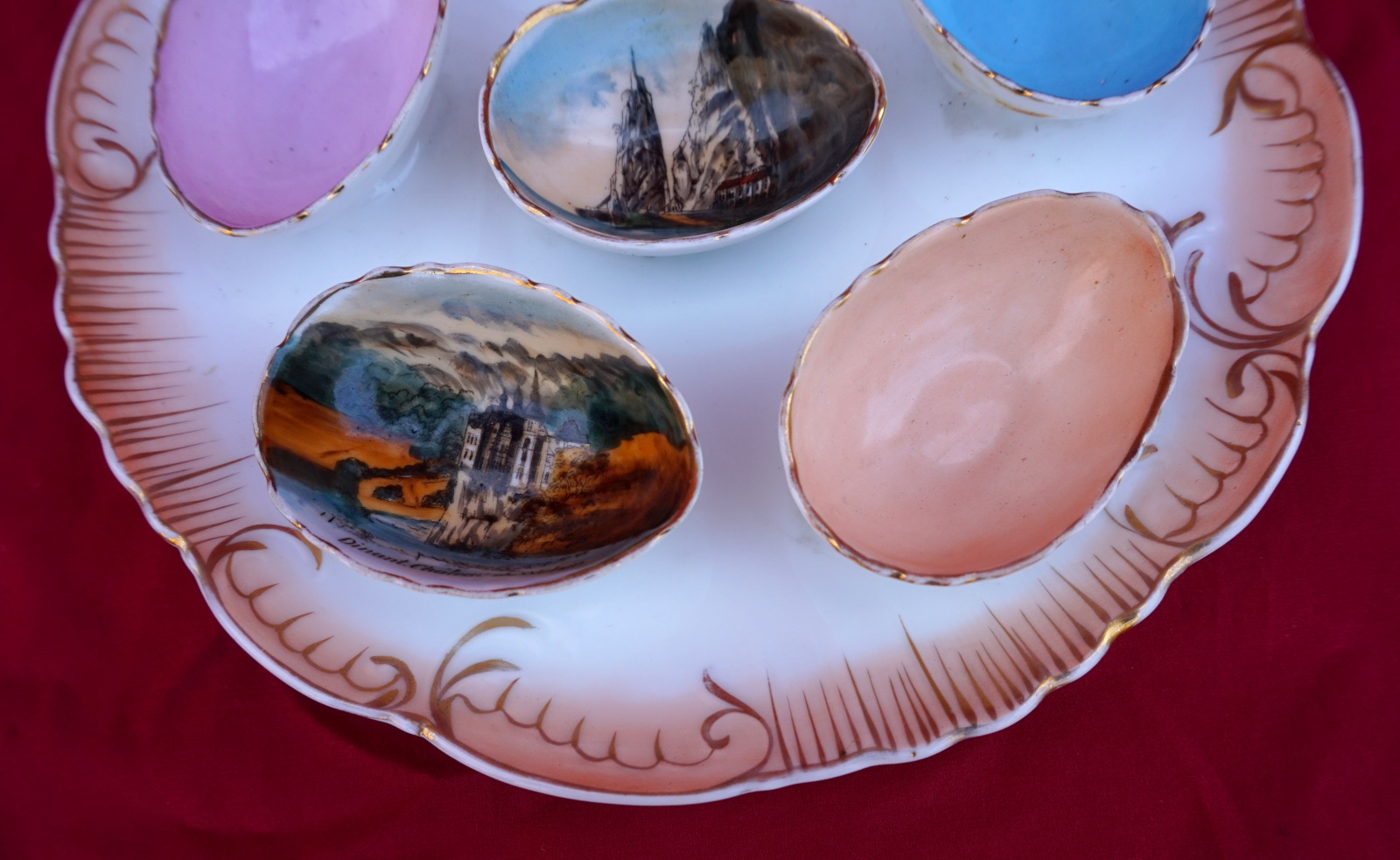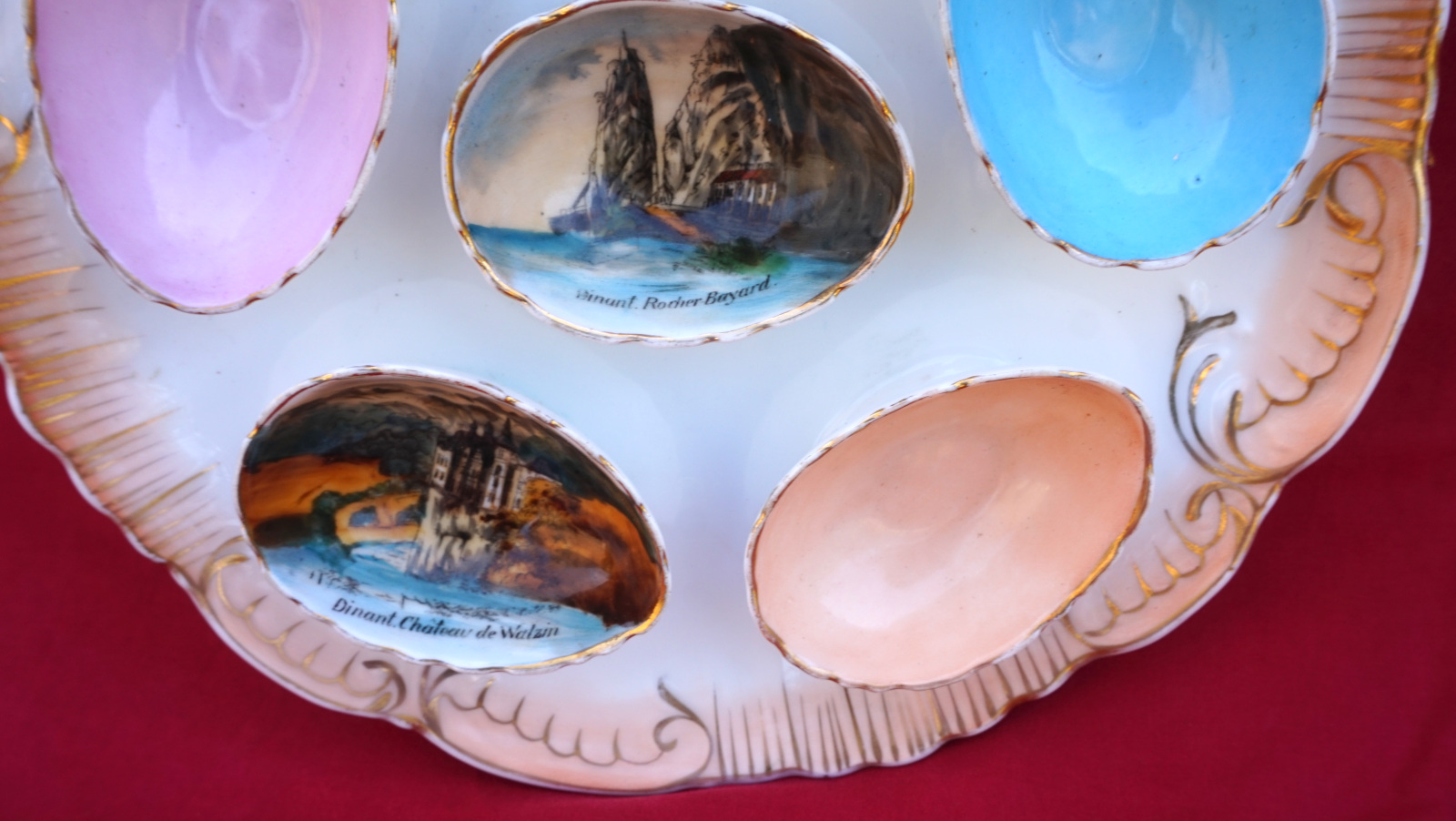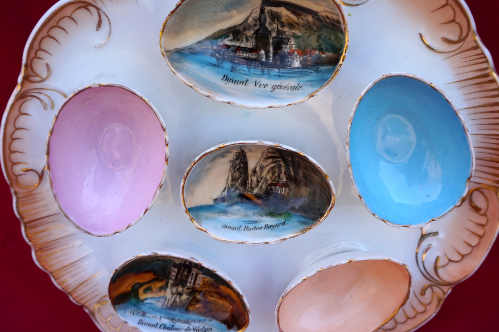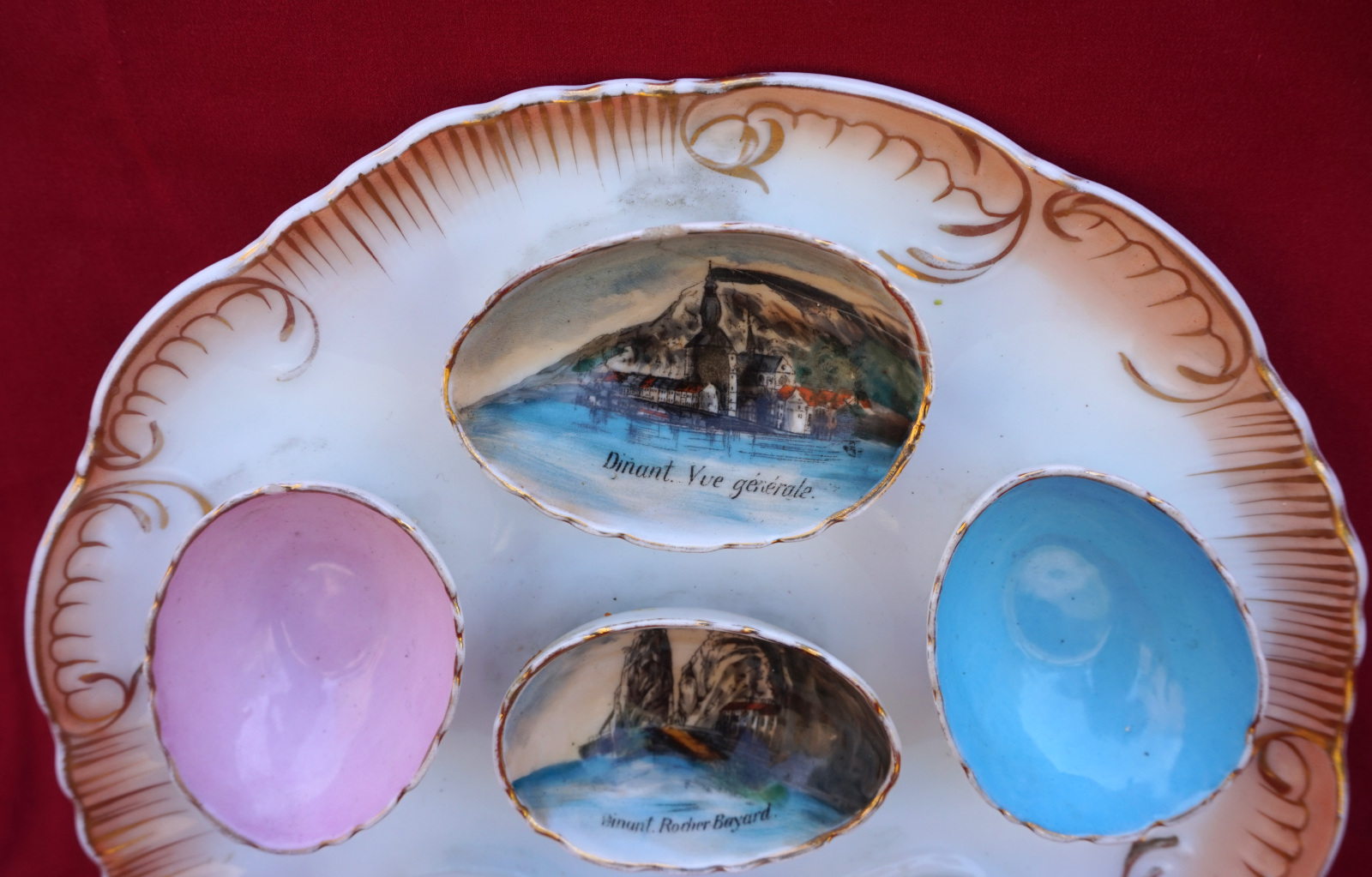 Assiette à oeufs en porcelaine peinte  de 3 décor de la ville de Dinant, début XX° siècle. Diamètre 23cm. Bel état, une égrenure et un cheveu sur un des coquetiers, voir photos.