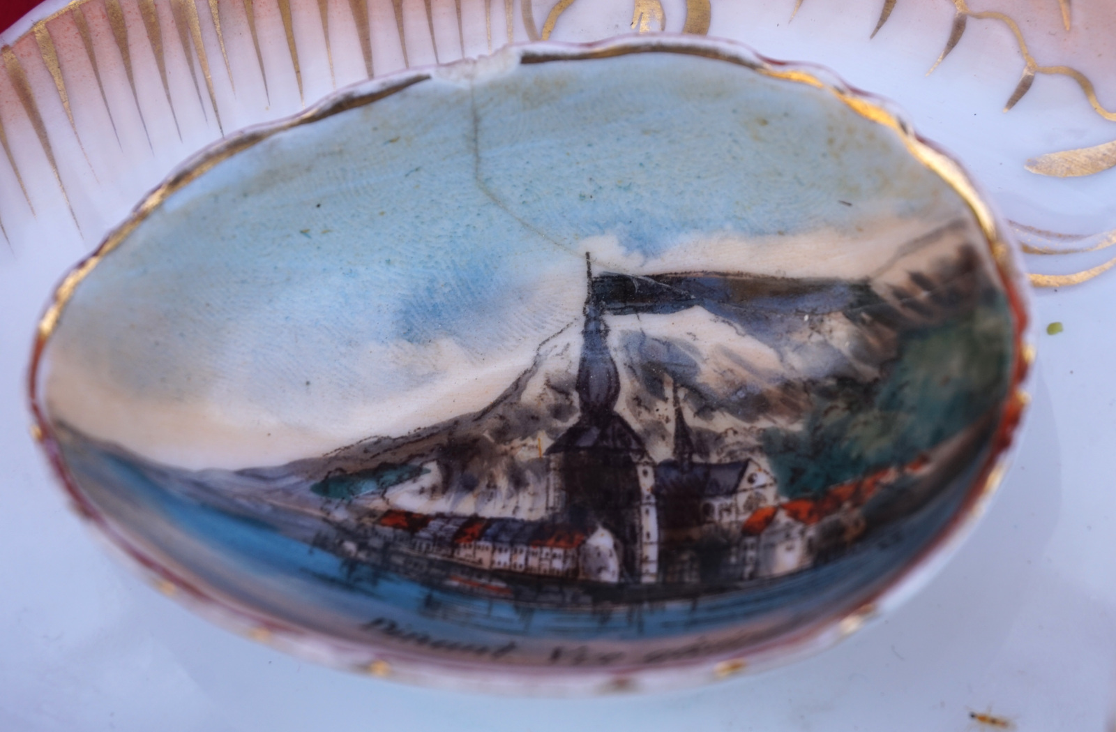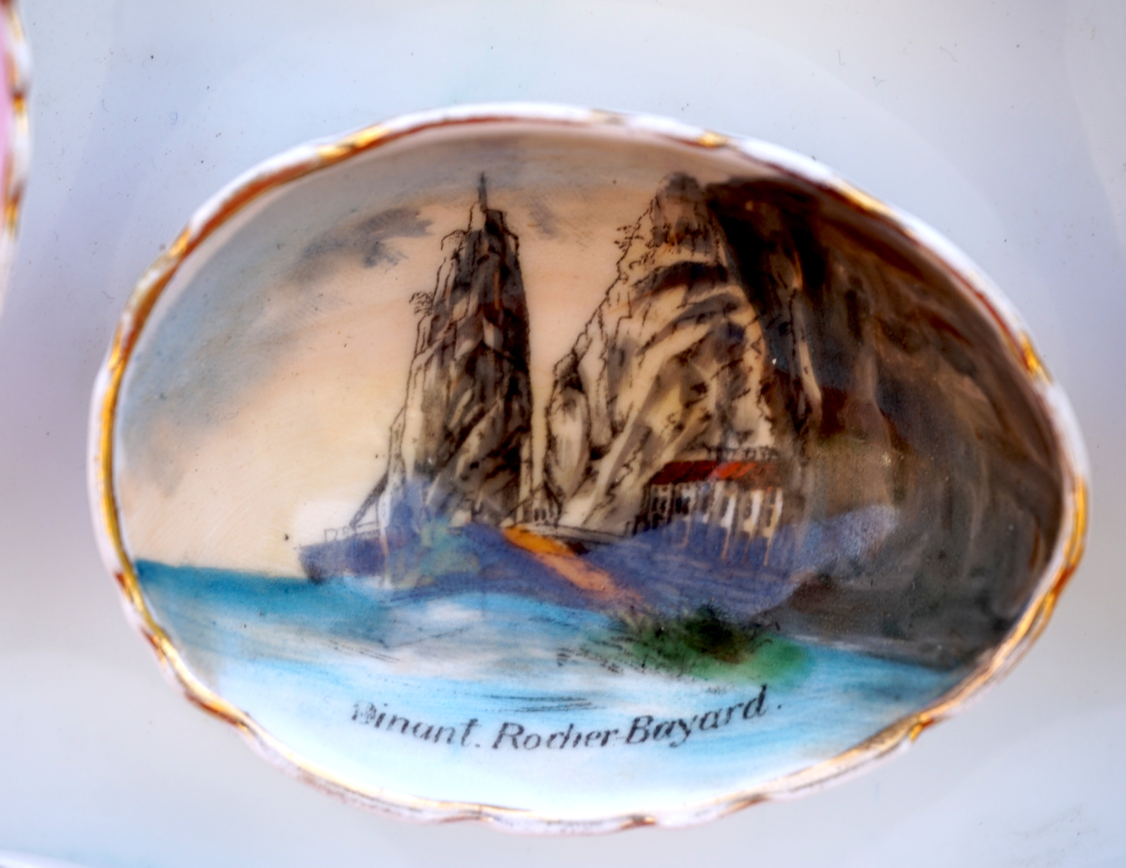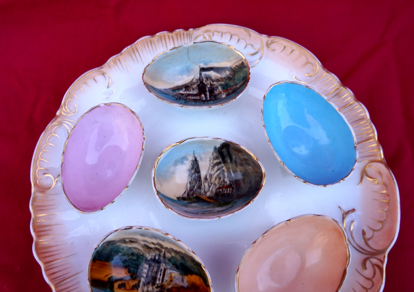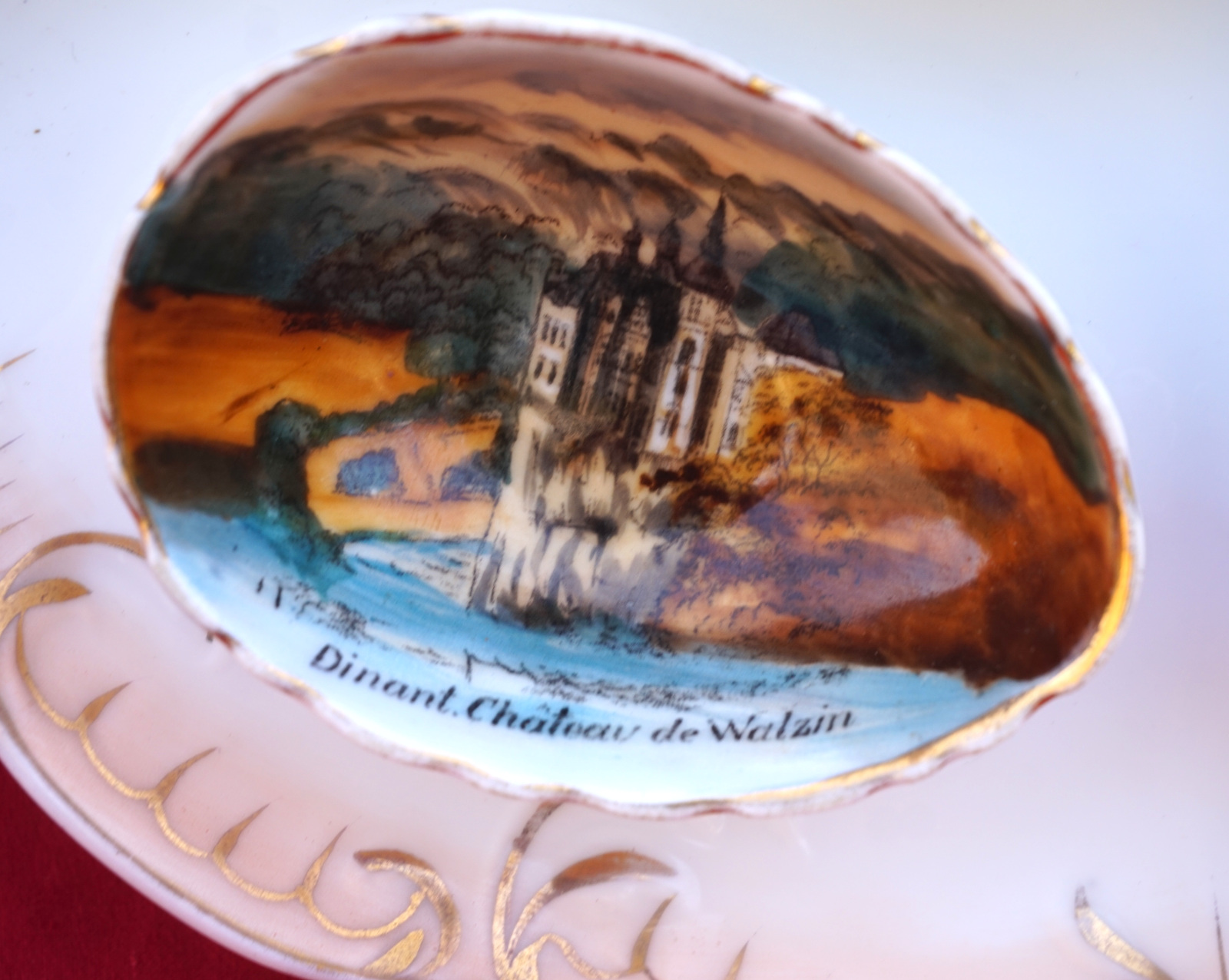 Assiette à oeufs en porcelaine peinte  de 3 décor de la ville de Dinant, début XX° siècle. Diamètre 23cm. Bel état, une égrenure et un cheveu sur un des coquetiers, voir photos.