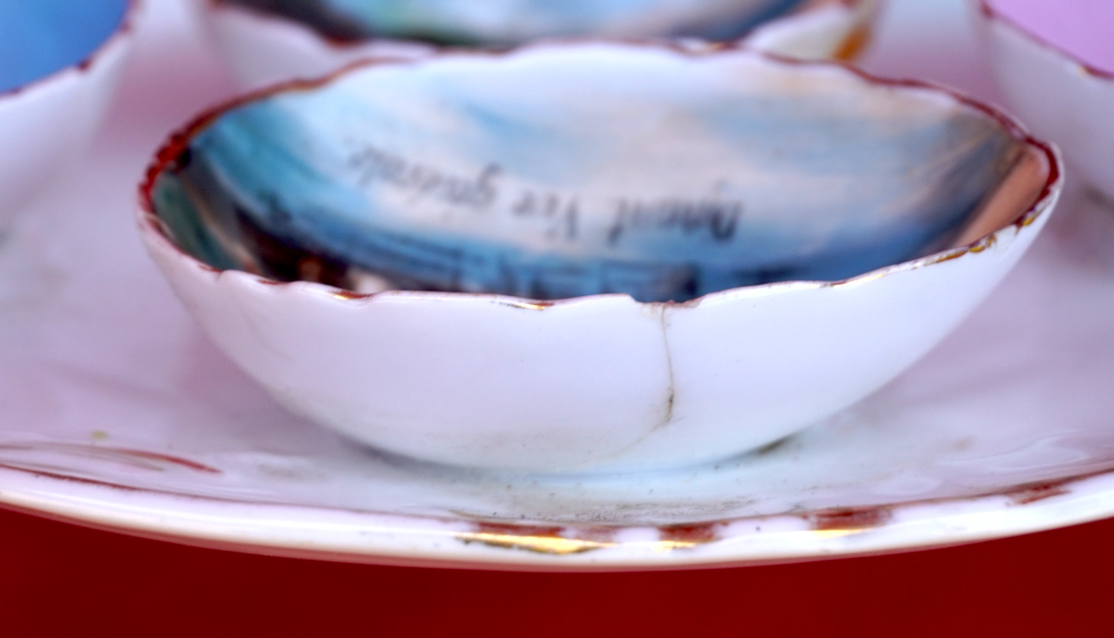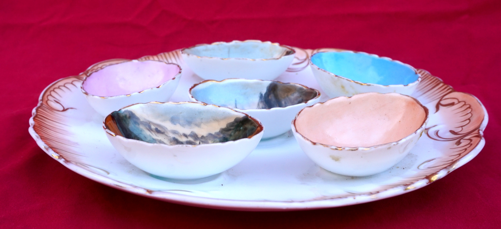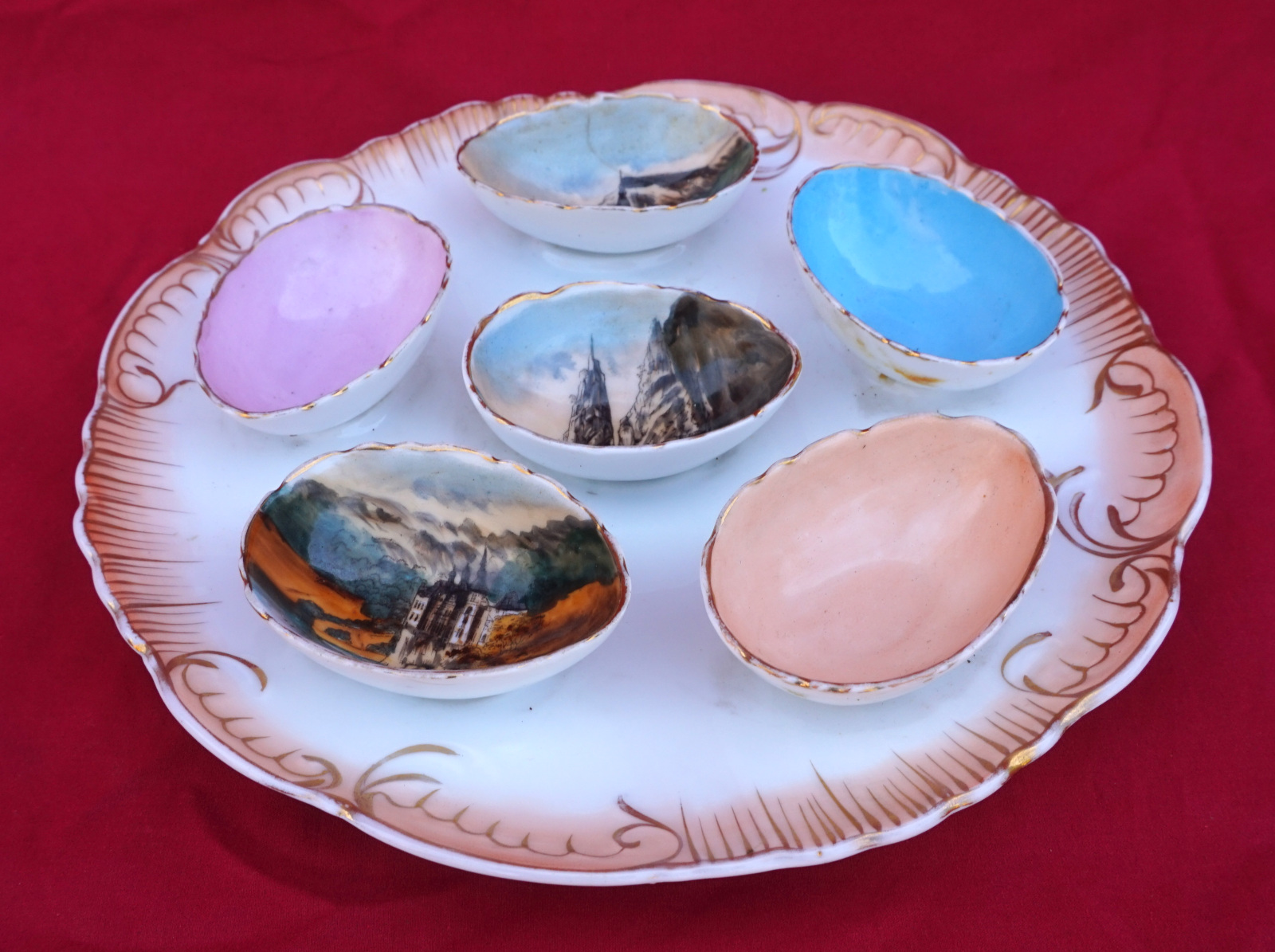 French porcelain egg holder serving platter with 3 landscapes of Dinant Brittany inside egg cups made by Limoges early 20th century. 9" (23cm) diameter. A tiny chip on an edge and glued.