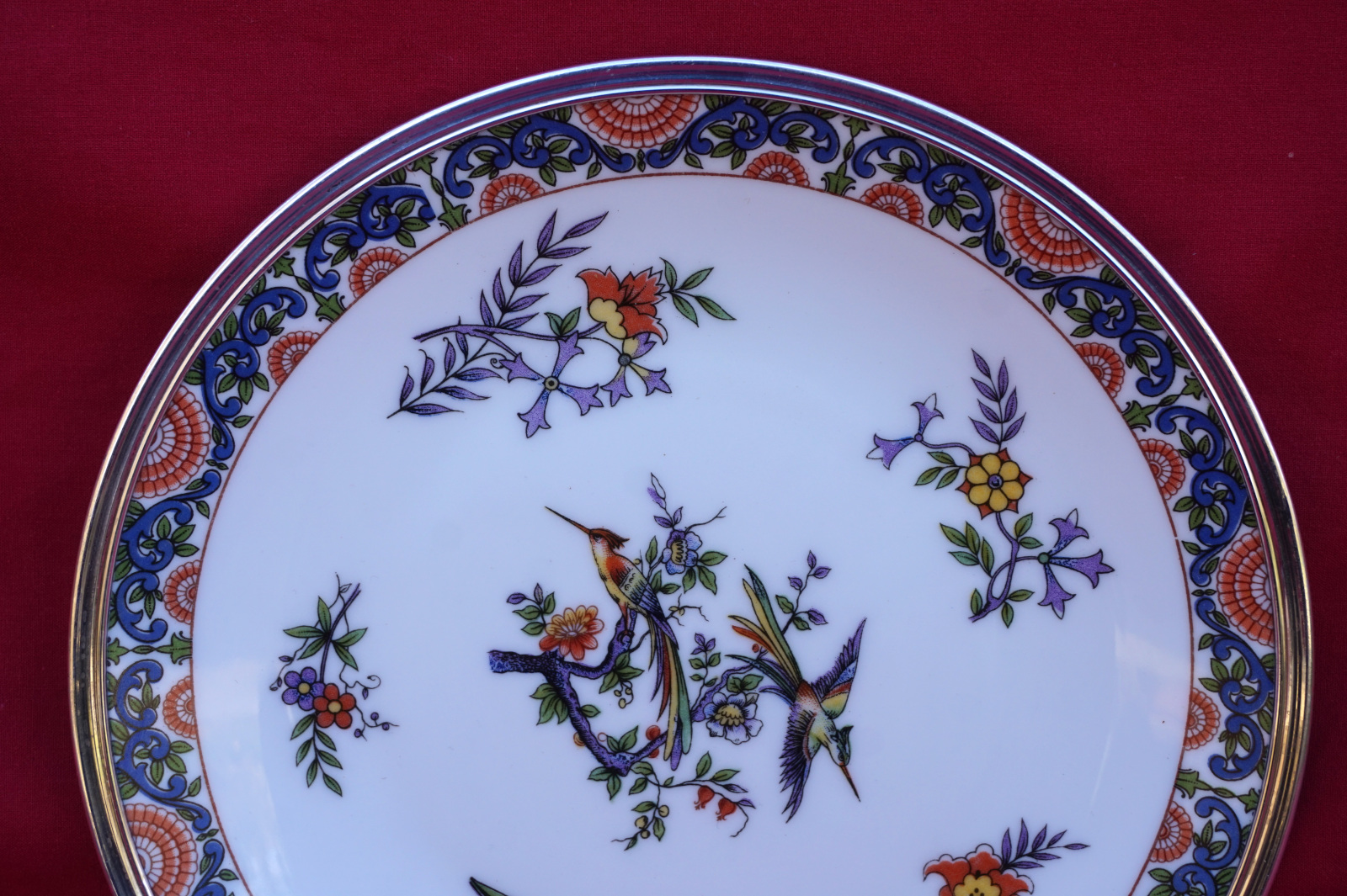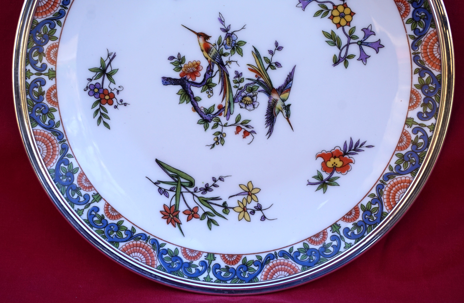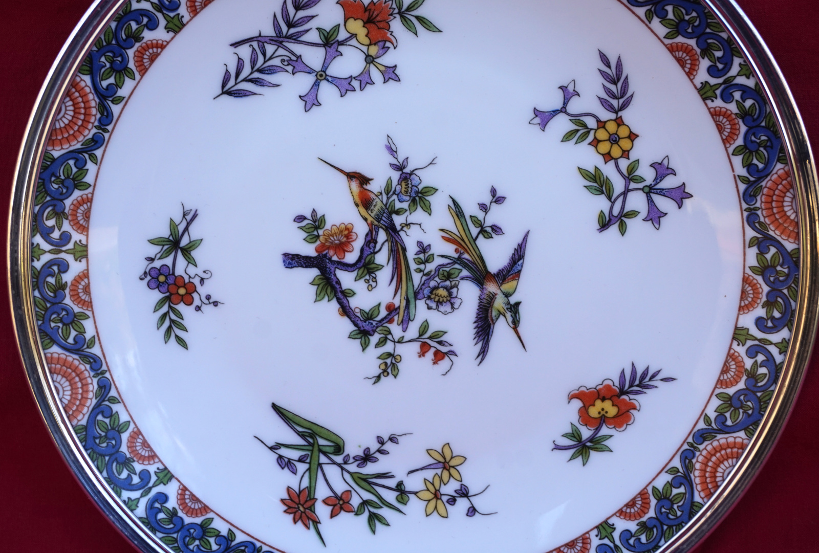 Assiette en porcelaine de Limoges à décor de fleurs et d'oiseaux par Raynaud à Limoges, cerclé d'un jonc en argent massif par Tetard Freres Paris, vers 1960's. Signé au dos et poinçon de maitrise et tête de minerve. 18.8cm de diamètre. Parfait état.