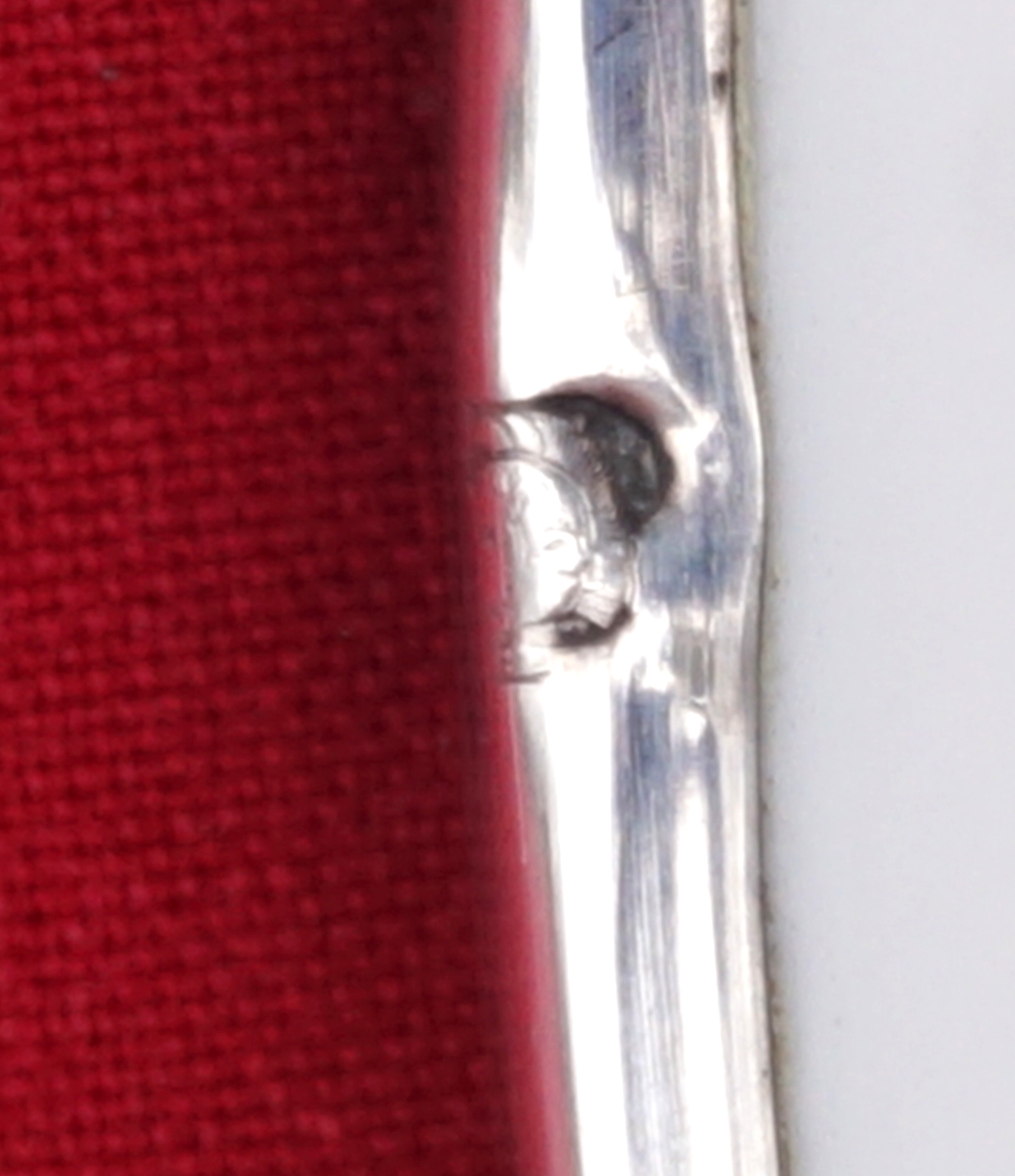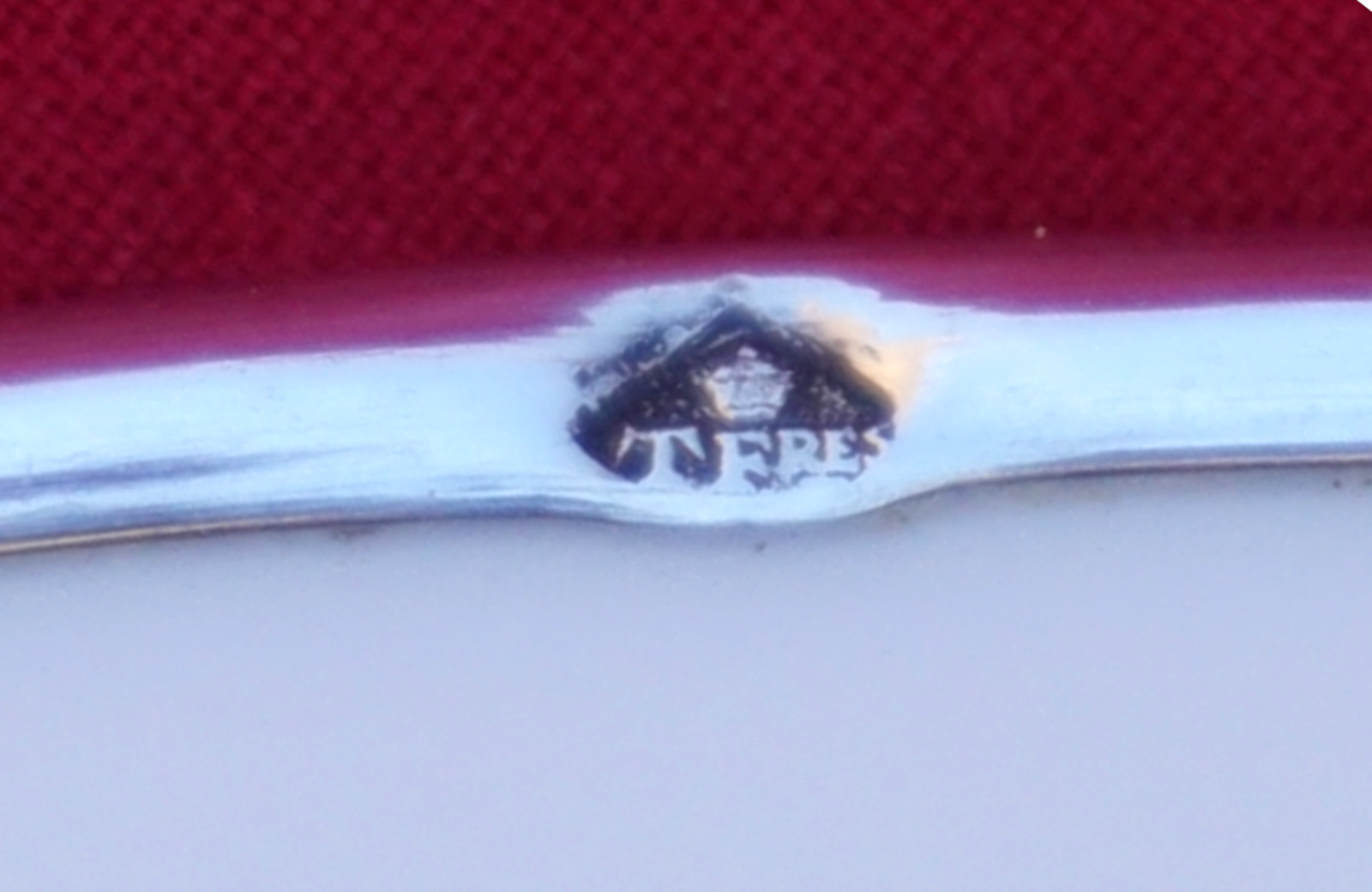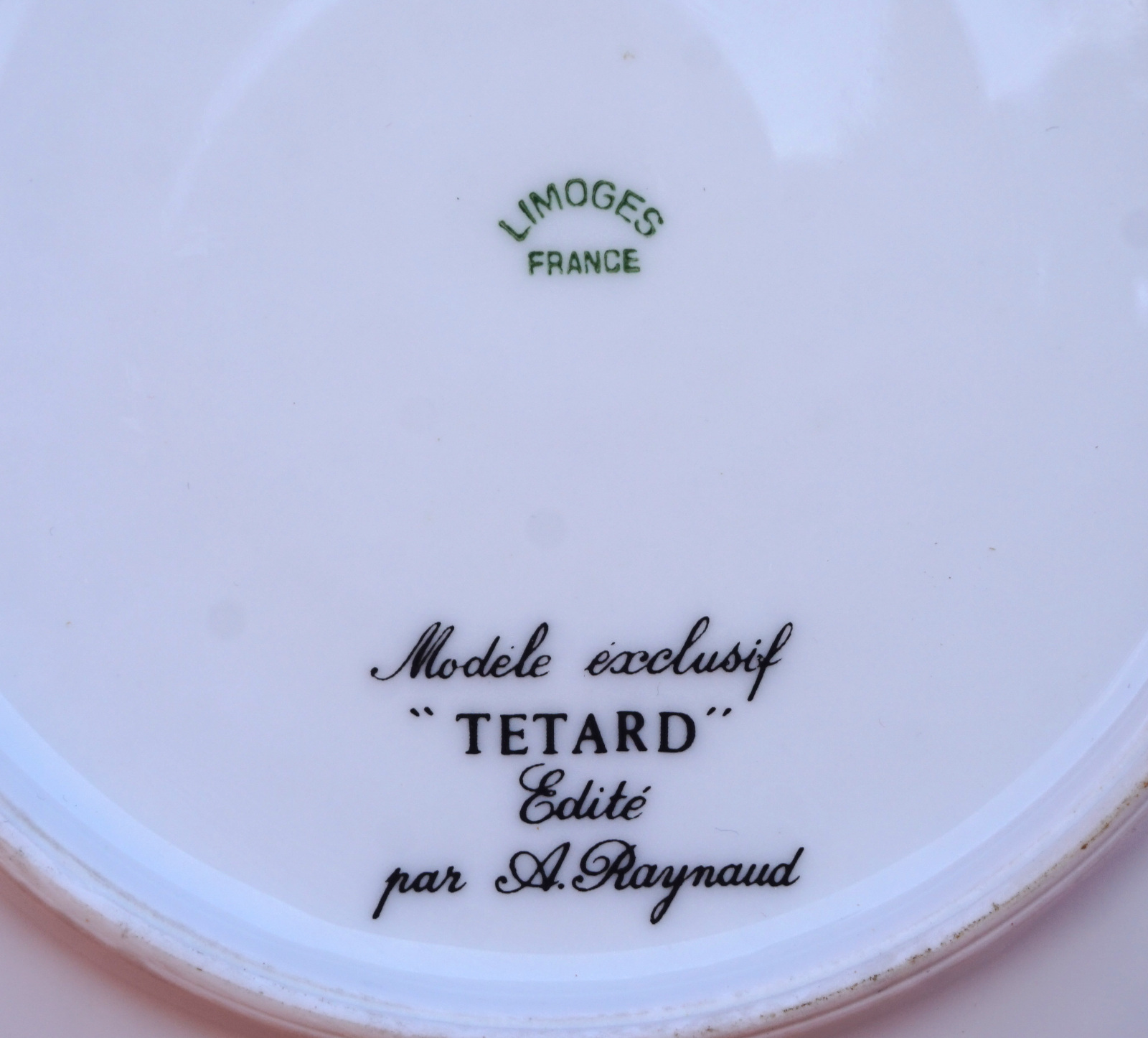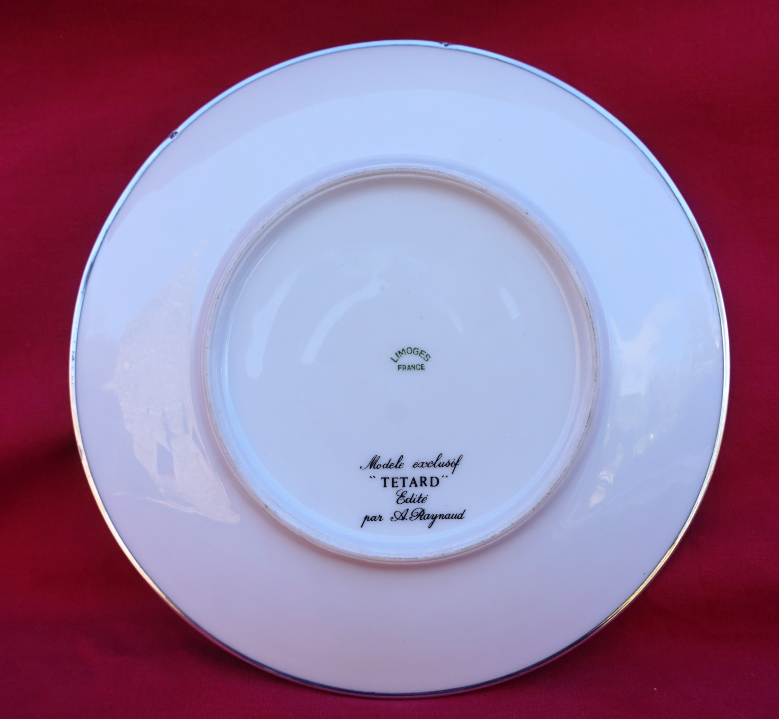 French transfer ware porcelain plate mounted with sterling silver rim Tetard pattern made by A Raynaud in Limoges and Freres Tetard in Paris during the mid-century. SIgned on the back for the porcelain and hallmarked with the head of Minerva, french sterling silver (.925) gurantee and the silversmith mark. 7 3/8" (18.8cm) diameter. Perfect condition as shown by the following pictures.