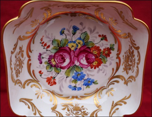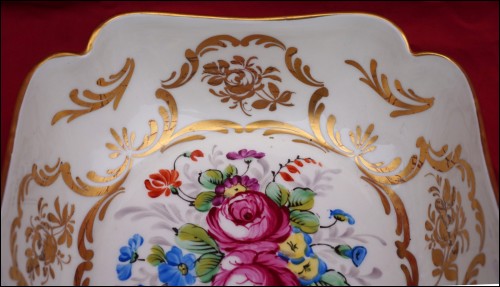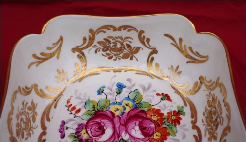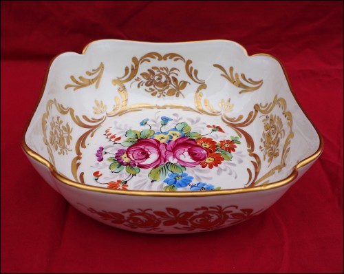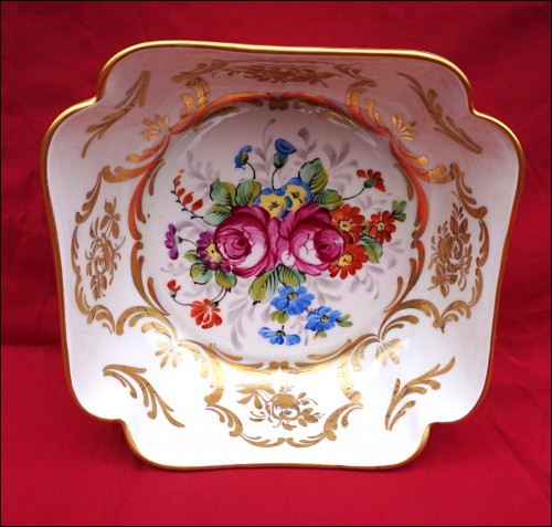 Coupe carrée en porcelaine de Paris peinte à la main et réhaussé or. Signée sur son fond. Dimensions: 21.5 cm par côté, hauteur 6.5 cm. Parfait état.