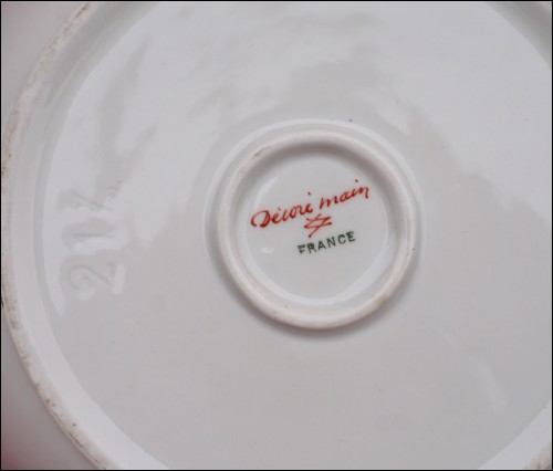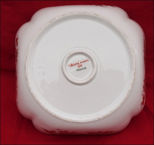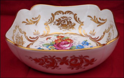 rench gilt and hand painted porcelain square bowl dish made in Paris. It's signed and numbered on the back. 8 1/2" (21.5cm) by side and 2 1/2" (6.5cm) depth. Perfect condition as shown by the following pictures.