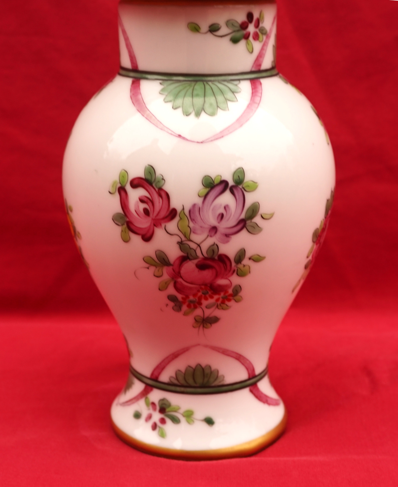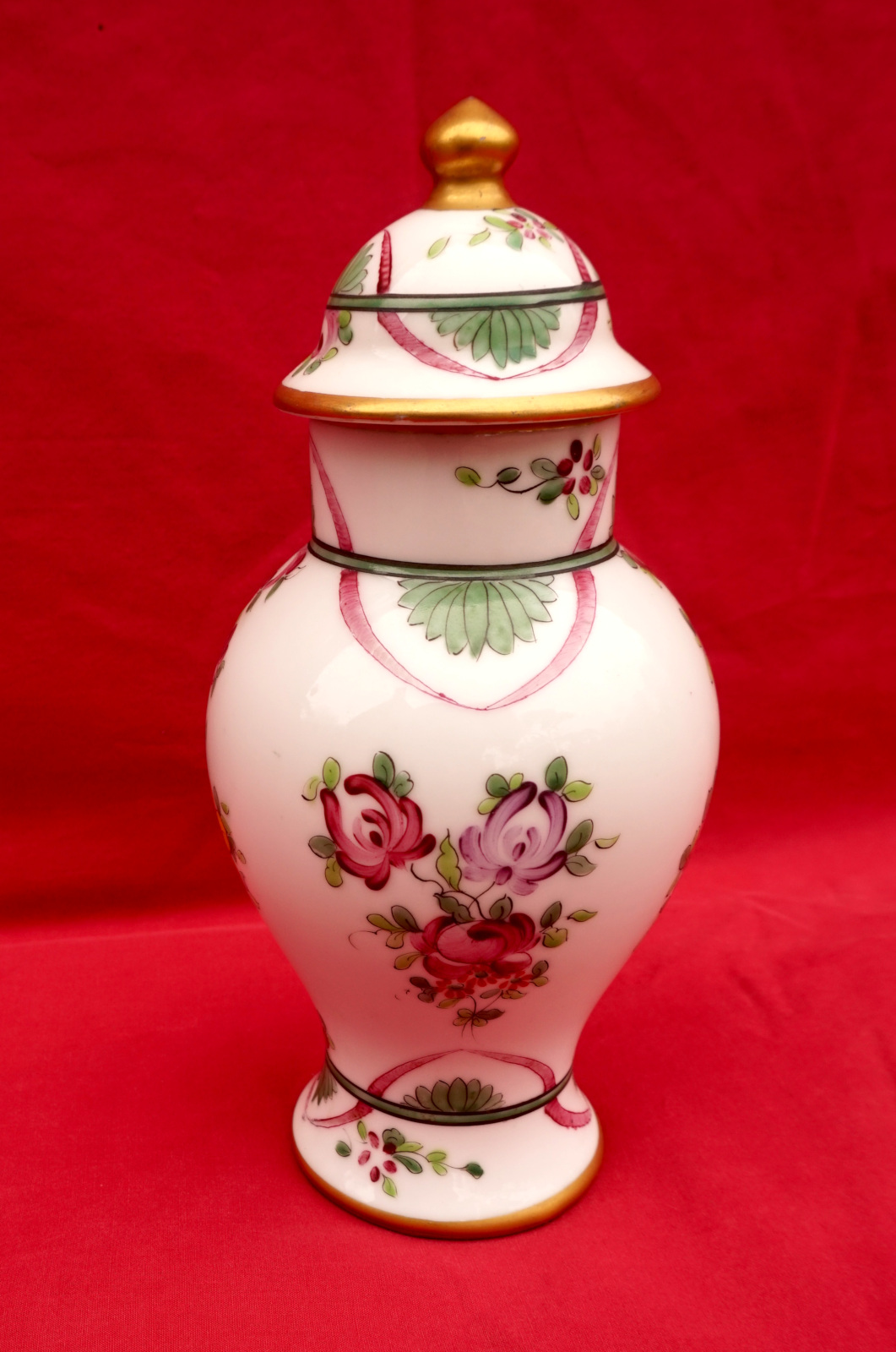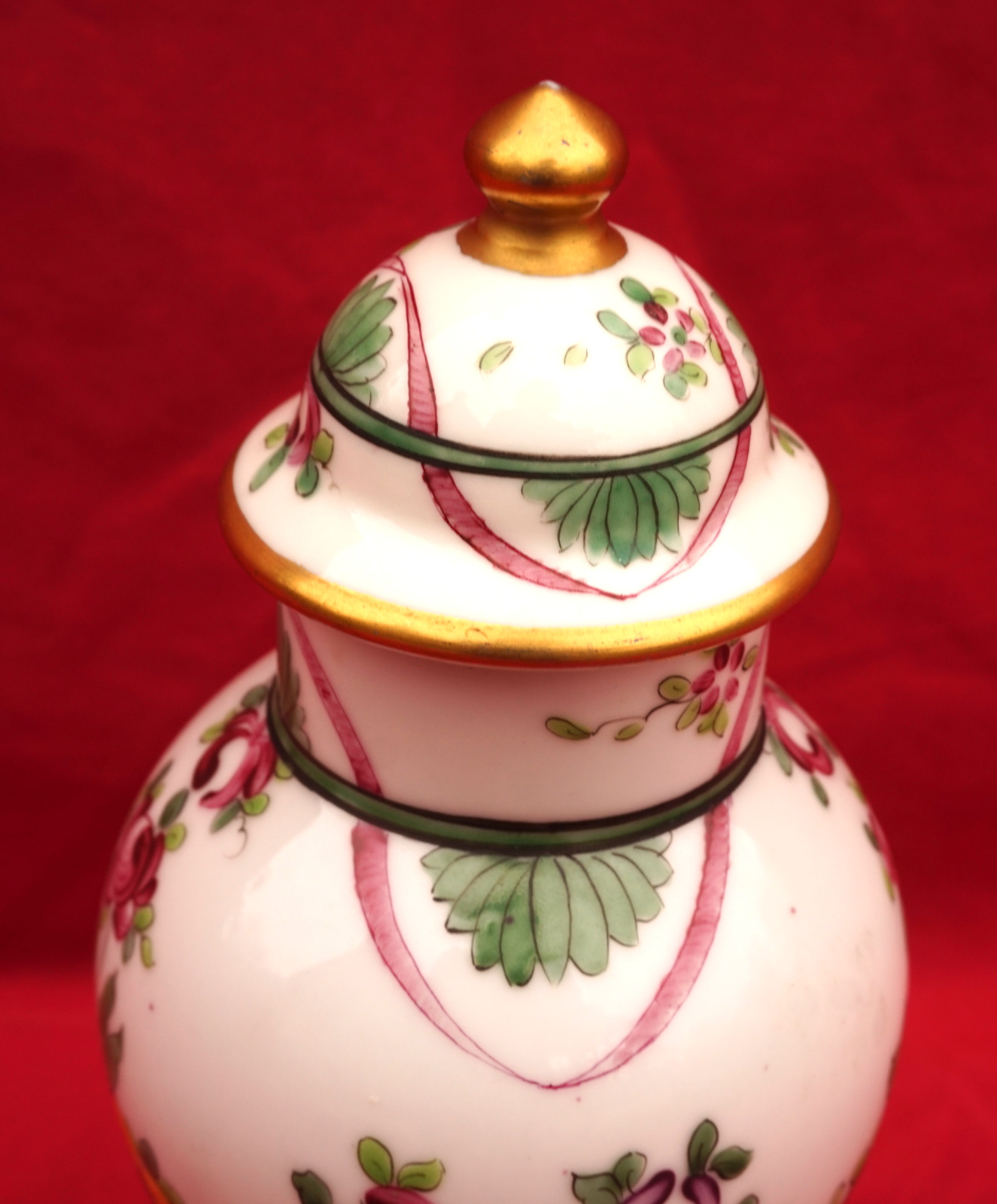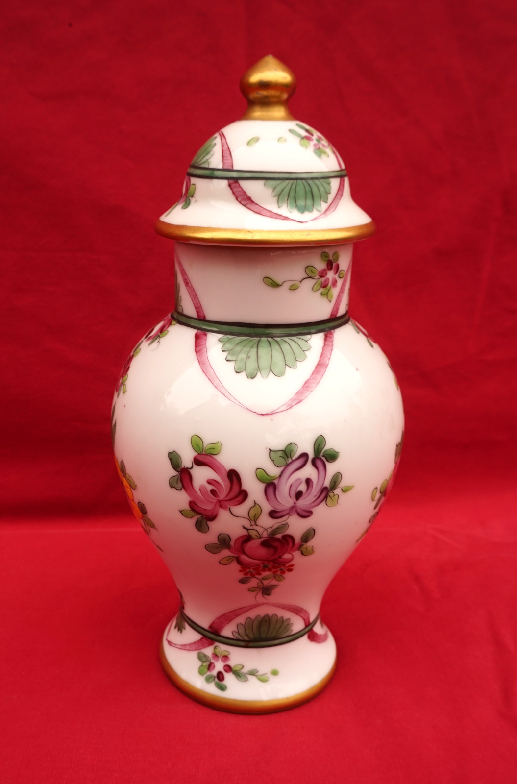 Pot à couvercle en porcelain peinte à la main d'un décor floral Samson Paris fin XIX° siècle. Signé sur son fond. Hauteur 19.1 cm, diamètre au corps 9 cm. Très bel état.