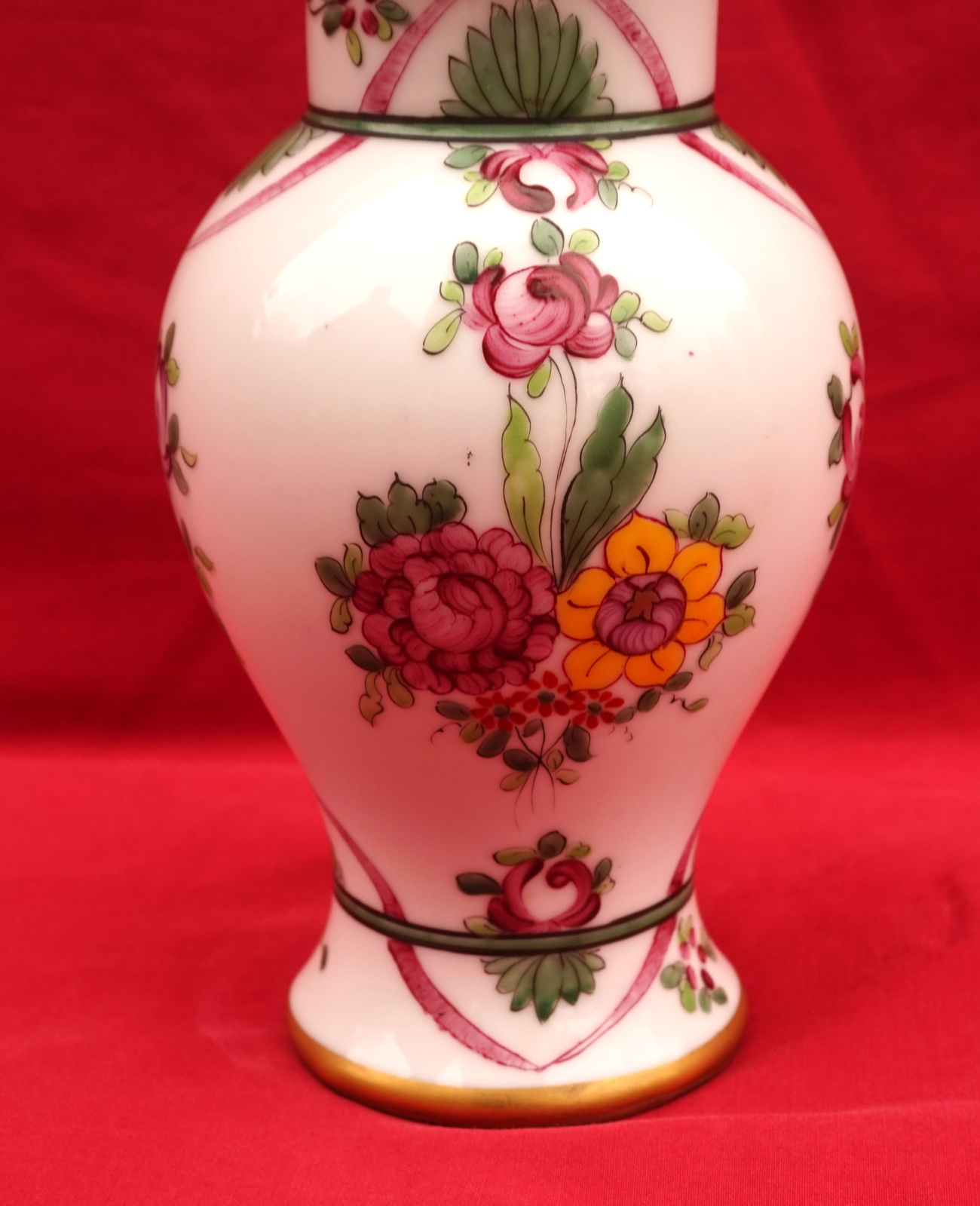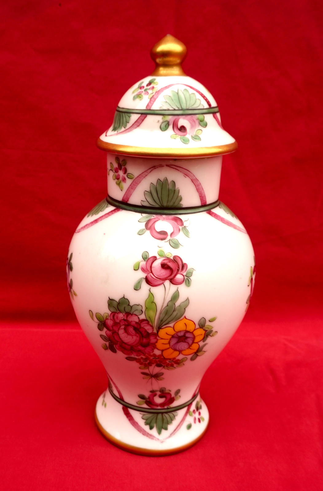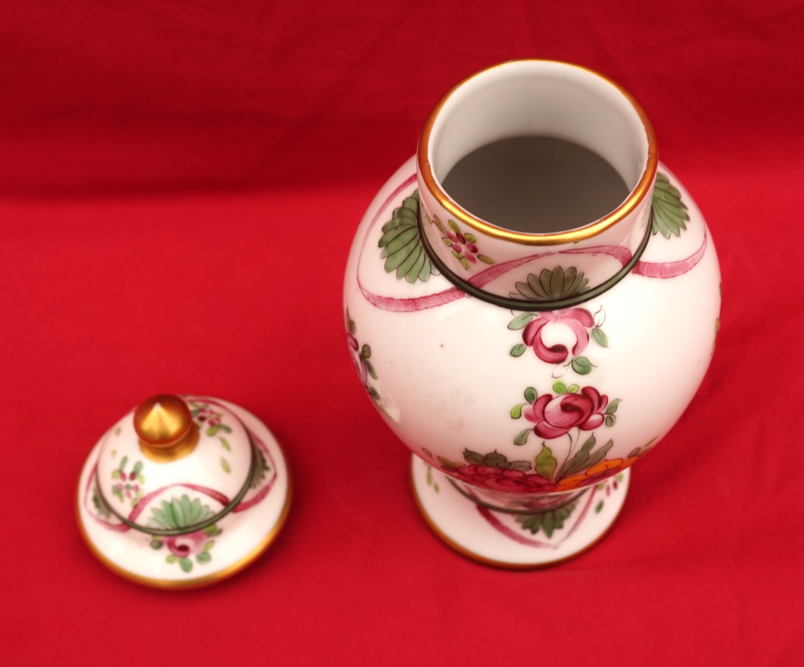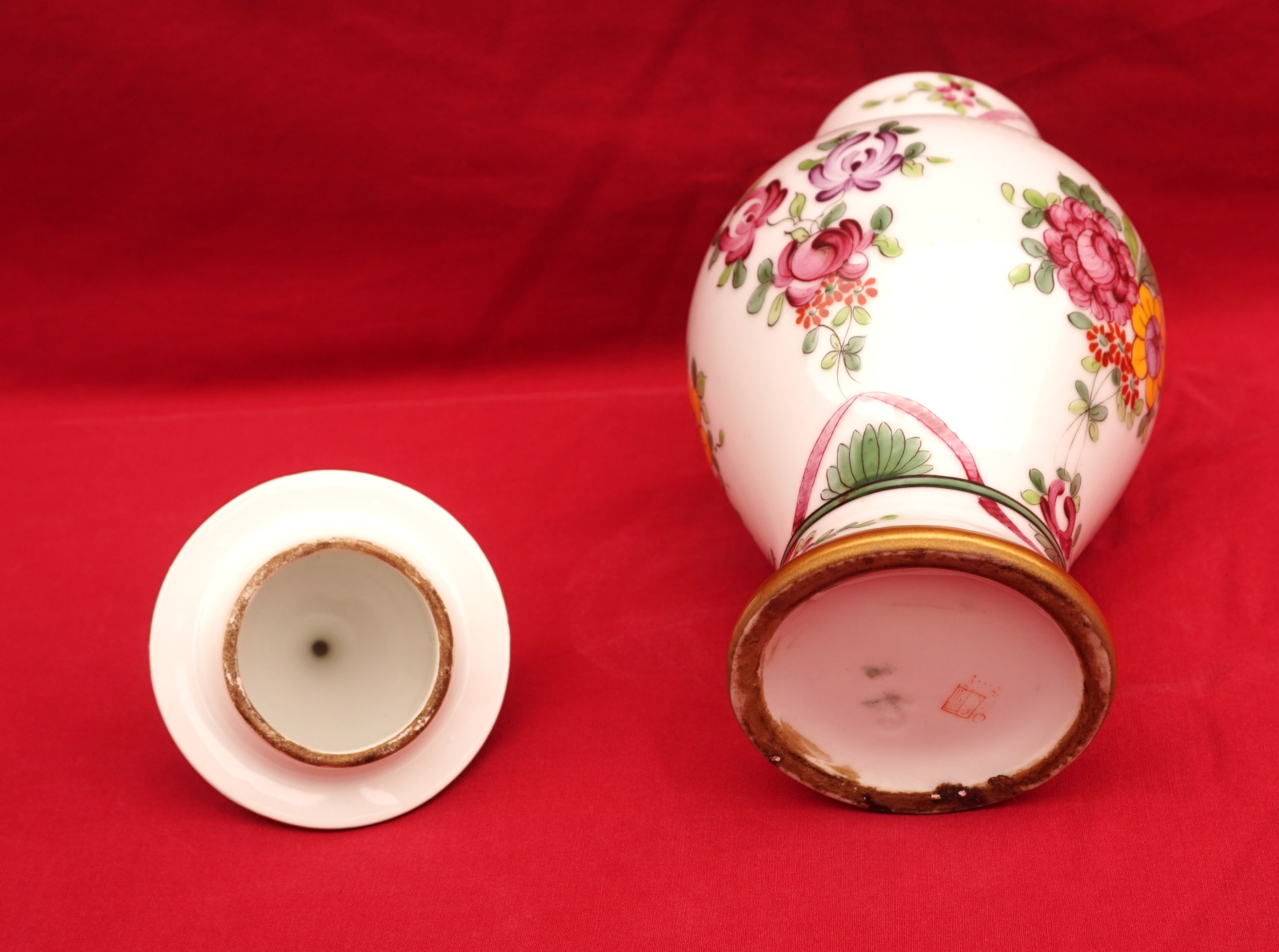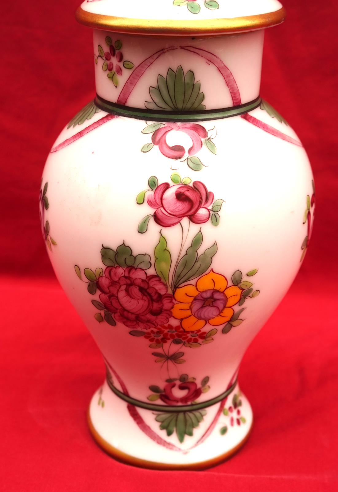 French hand painted porcelain lidded pot showing floral decor with gilt border made by Samson Paris late 19th century. It's signed on the back. 7 1/2" (19.1cm) height, 3 1/2" (9cm) diameter to the body. Perfect condition.