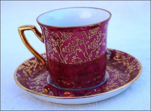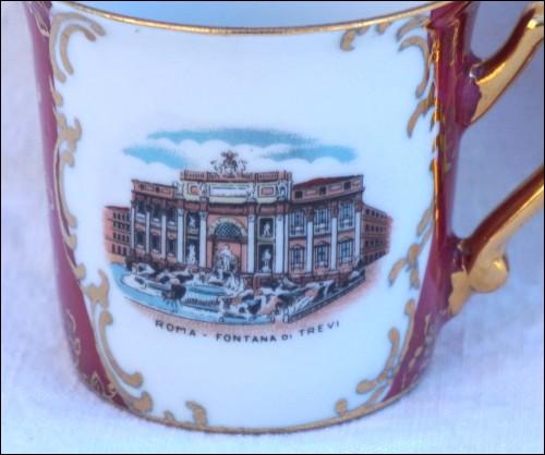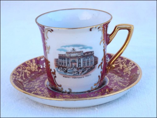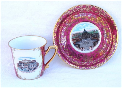Tasse de décorateur en porcelaine italienne, décoré par transfert de la fontaine de Trèvise et la basilique de St Pierre de Rome. Elle est doré à la main, sur le fond marque d'épargneur d'or. Diamètre de la soucoupe 11,3 cm, hauteur de la tasse 6 cm.