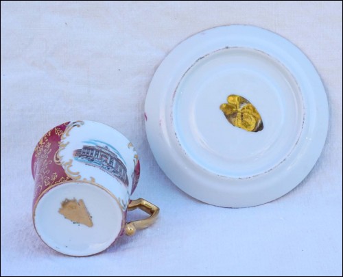 Italian porcelain cup and saucer showing Trevi Fountain and St Peter's Basilica by transferware with red and gold background. They are signed on the back. 4 1/3" (11.3cm) diameter for the saucer and 2 3/8" (6cm) height for the cup. Perfect condition as shown by the following pictures.
