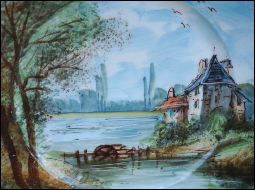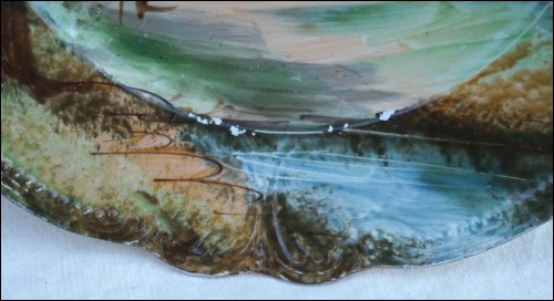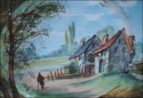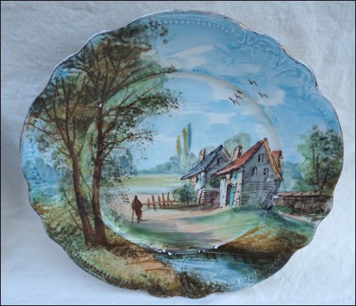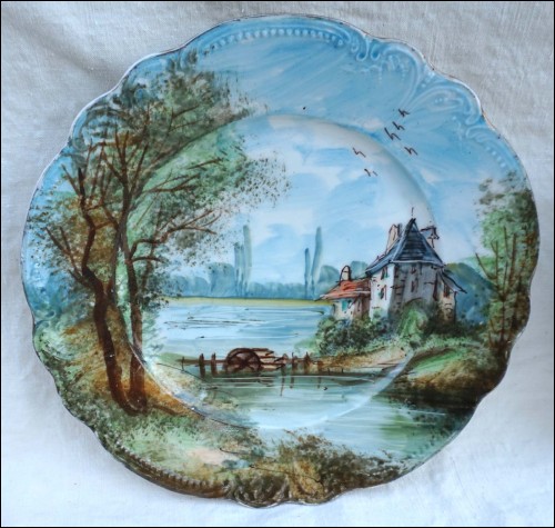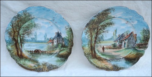 French riverscape Barbizon school hand painted porcelain pair of decorative plate made during the end of the 19th century. 9 3/4" (24.8cm) diameter. Beautiful condition a few tiny paint shortage as shown by the following pictures.
