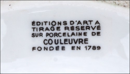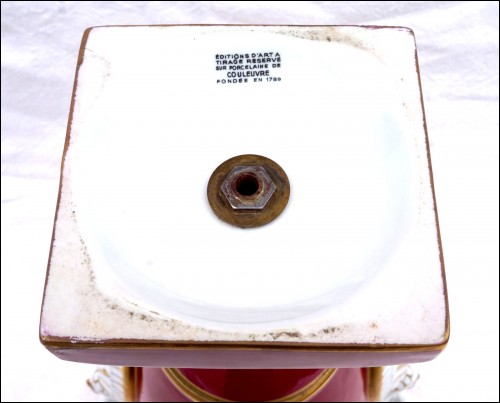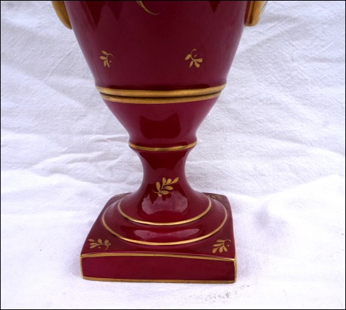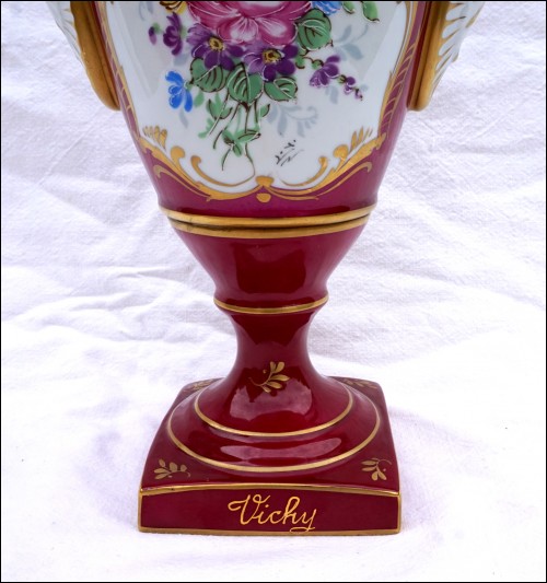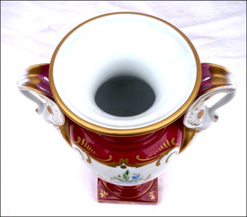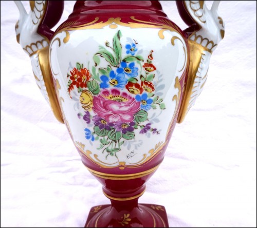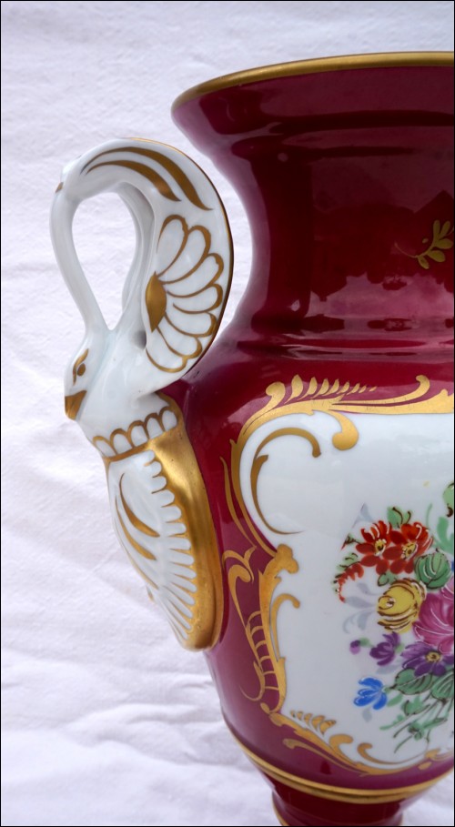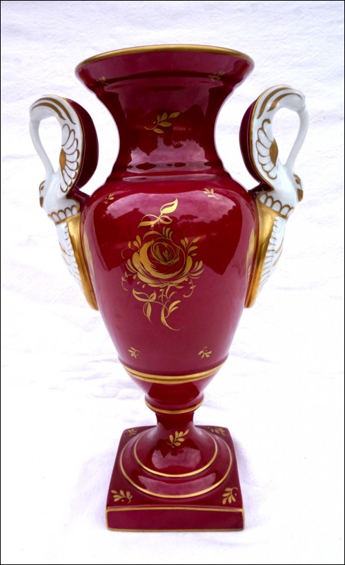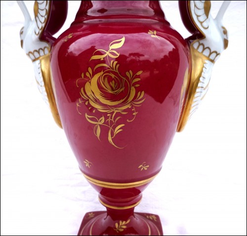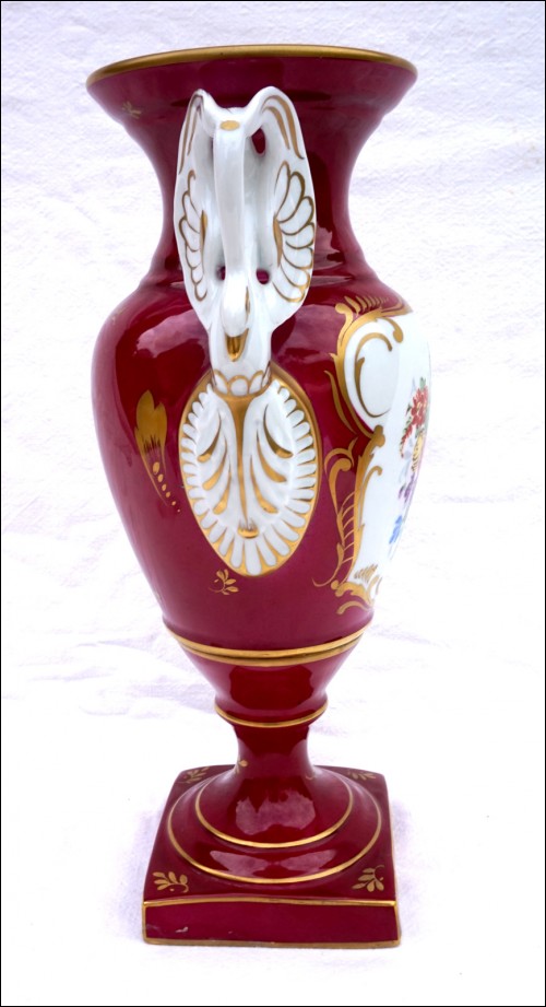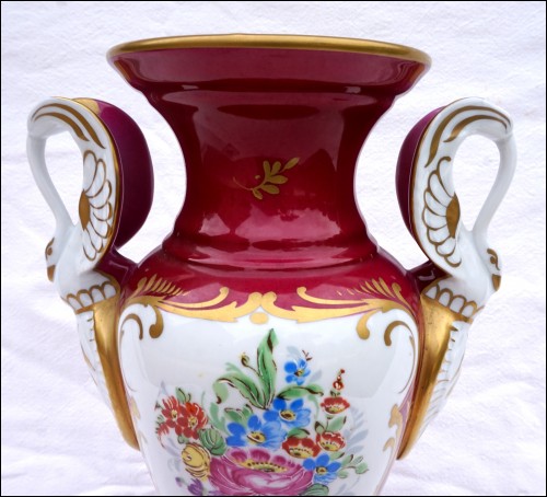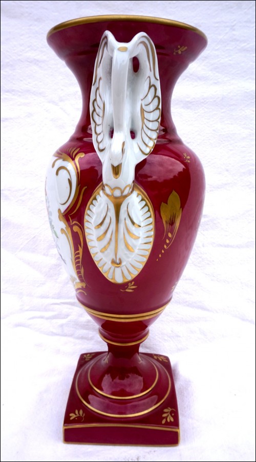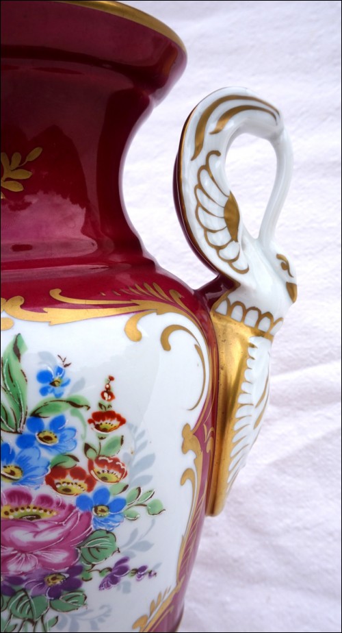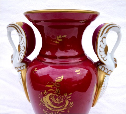rench Empire style large baluster vase in hand painted porcelain ruby and gold on white with flowers in medallion made by La Couleuvre near Limoges for Vichy city. It's signed on the back. 12 3/4" (31.7cm) height, 8 1/4" (21cm) width with the swan handles. Perfect condition as shown by the following pictures.