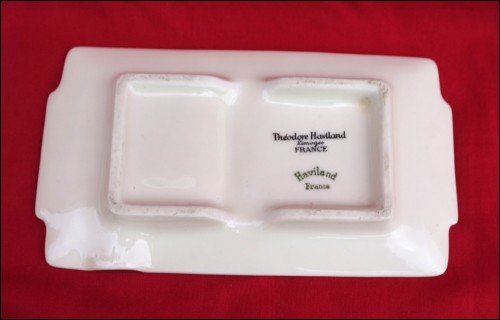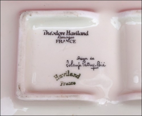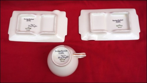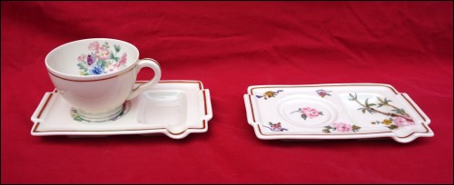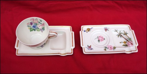 Tasse à café avec sa soucoupe cendrier par Solange Paty-Bié pour Théodore Haviland Limoges, milieu XXe siècle. Ils sont signés sur leurs fonds. Dimensions pour la tasse : hauteur 5.5 cm, diamètre 7.3 cm, pour la soucoupe 15 cm x 8.5 cm. Très bel état, une deuxième soucoupe avec.