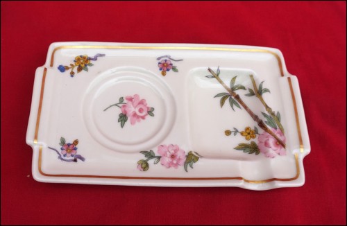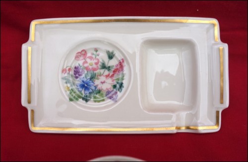 Vintage french flower and gilt porcelain, design Solange Patry- Bié, coffee cup with ashtray saucer made by Théodore Haviland in Limoges during the mid-century. They measure for the cup: 2 7/8" (7.3cm) diameter without handle, 2 1/8" (5.5cm) height and for the ashtray saucer 5 7/8" (15cm) by 3 3/8" (8.5cm). They are signed on the back. Perfect condition, they come with another astray saucer as shown by the following pictures.