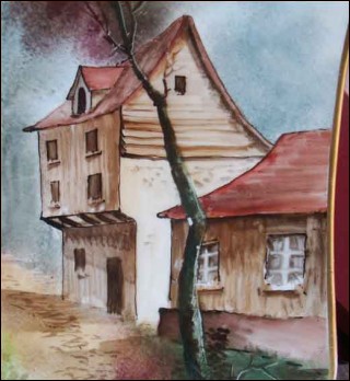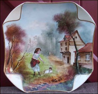 Rare French porcelain square decorative dish made in Paris during the 1880's. the romantic hand painted decor depicts a young lady with a lamp in the landscape. Perfect condition. It has 2 holes for hanging on the back. It's engraving XI on the back for the signature. 11"5/8 by side.