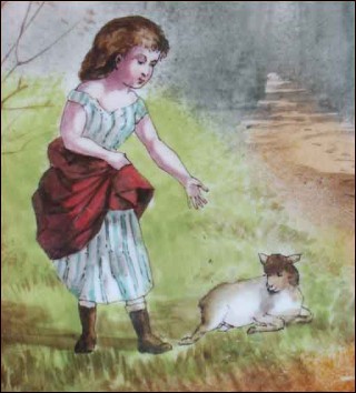 Plat en mouchoir en porcelaine de Vieux Paris vers 1880. Il est peint à la main d'un décor romantique d'une fillette donnant à manger à un agneau. Bon état. Signé XI par coup d'ongles dans la pate. Dimensions: 29.5 cm par 29.5 cm.