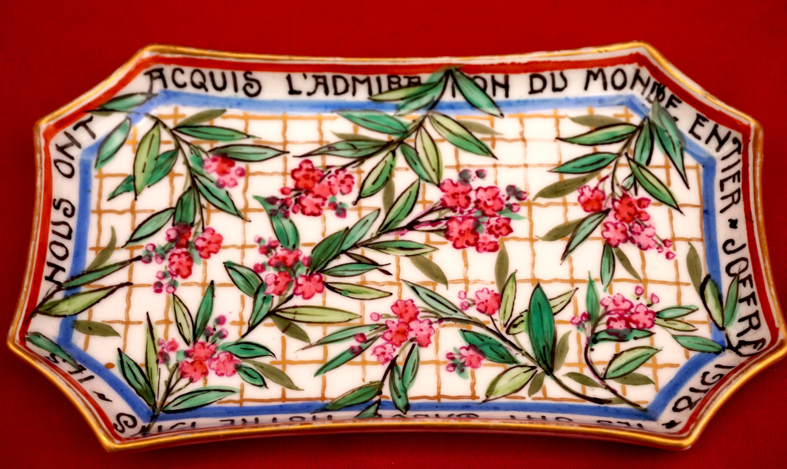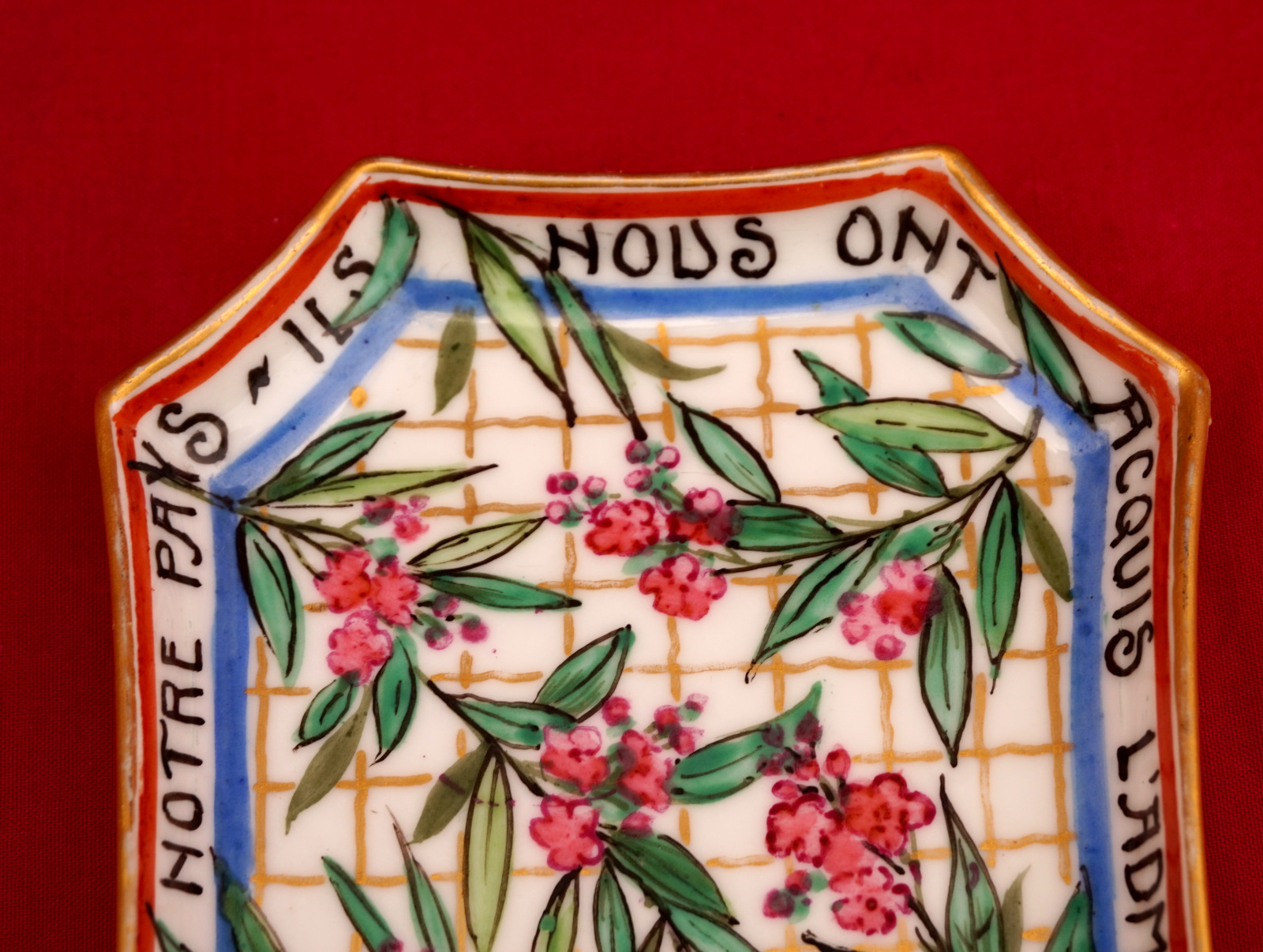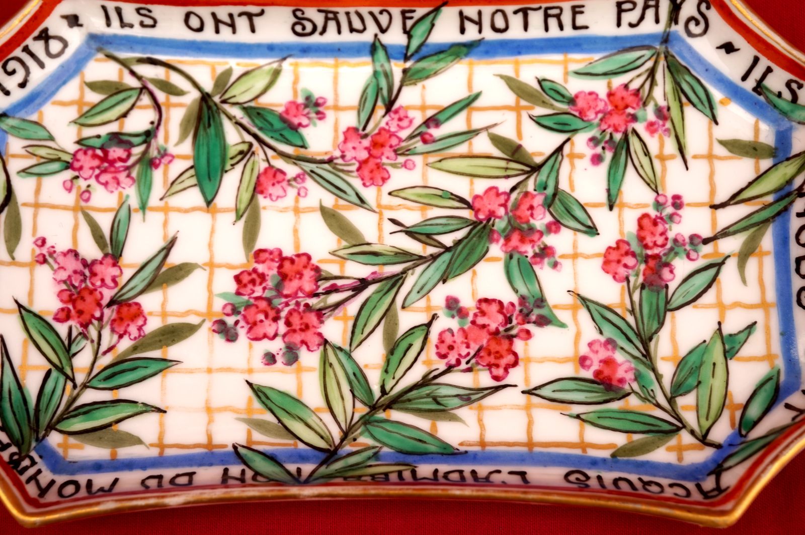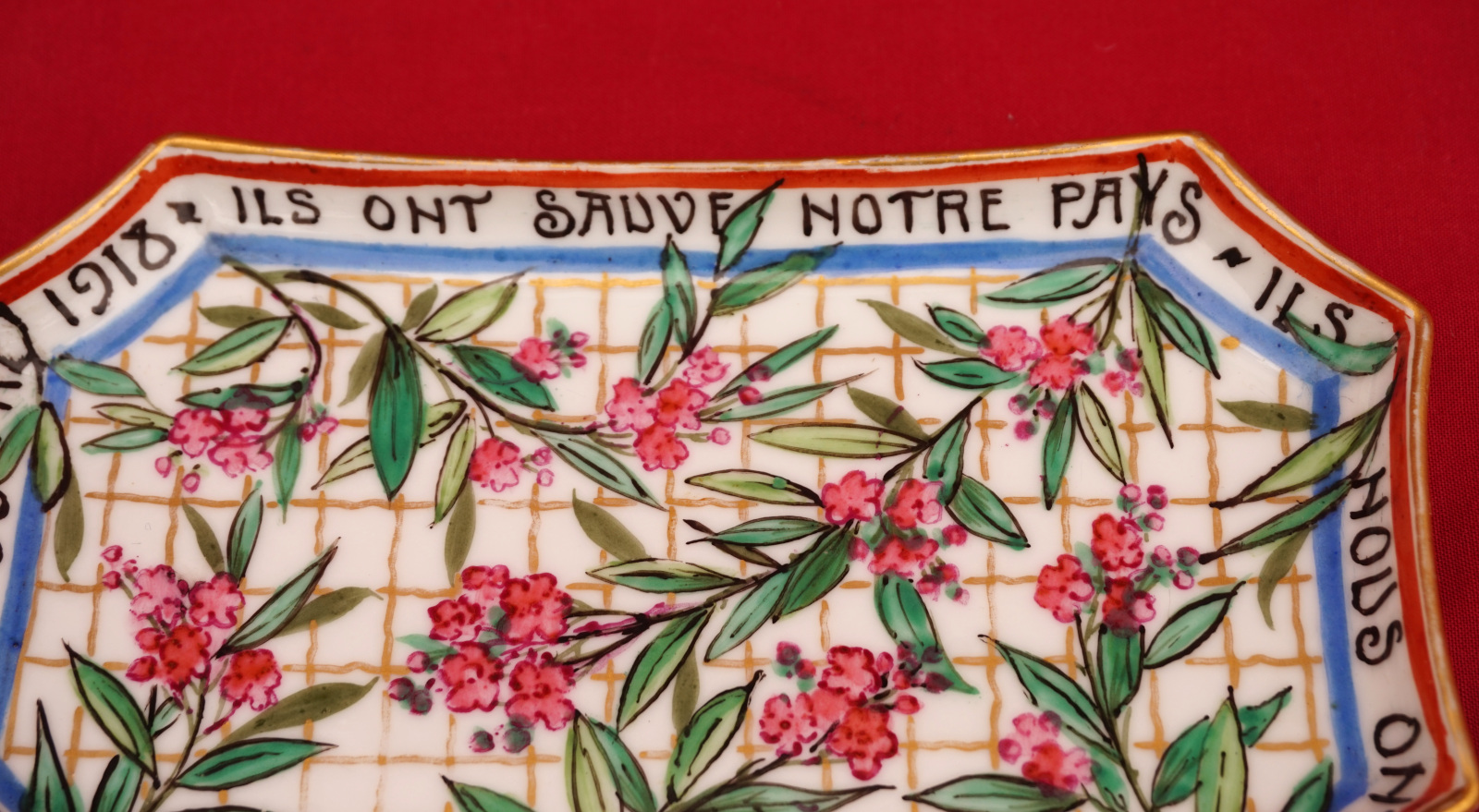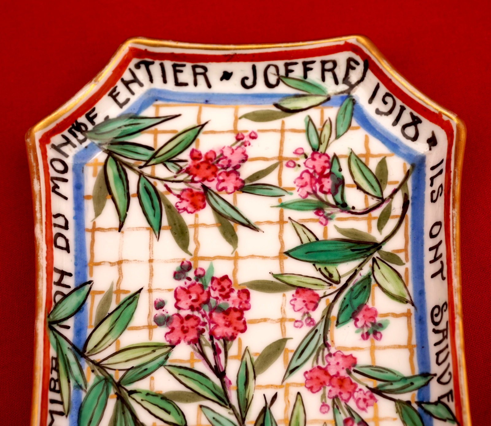 French hand painted porcelain commemorative tidy showing the motto "Ils ont sauvé notre pays, ils nous ont acquis l’admiration du monde entier",They saved our country, they won us the admiration of the whole world, Général Joffre 1918. It's signed on the back. 5" (12.7cm) by 3" (7.8cm). Perfect condition.
