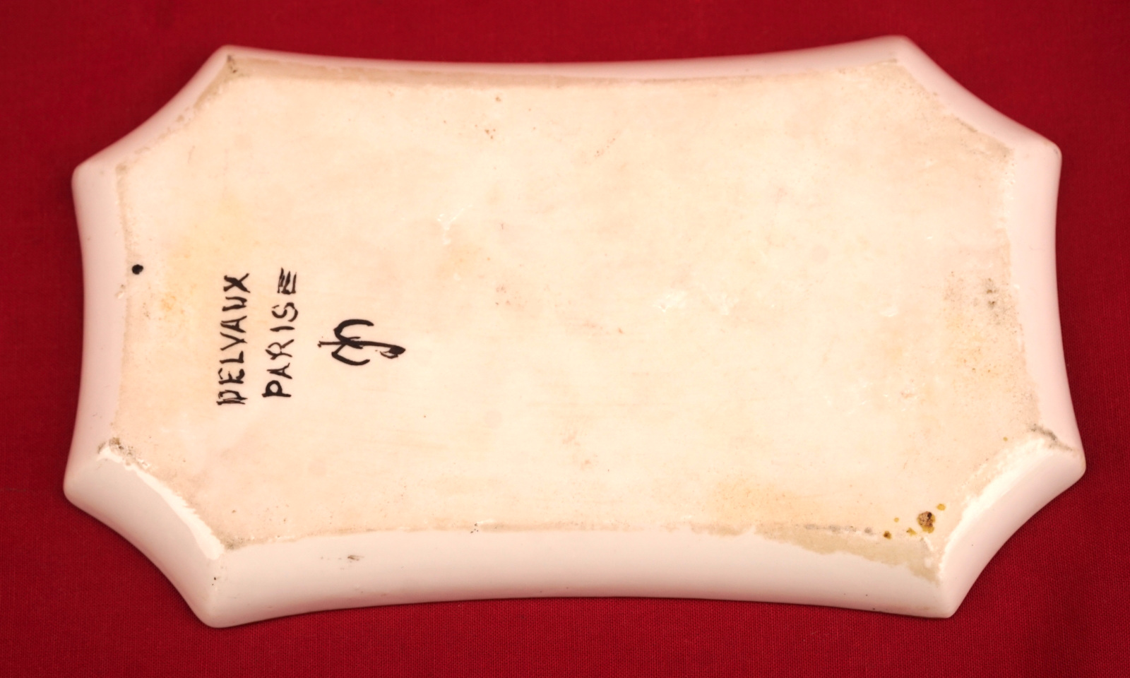 Vide poche commémoratif, ww1, en porcelaine peinte à la main portant la devise "Ils ont sauvé notre pays, ils nous ont acquis l’admiration du monde entier" Maréchal Joffre 1918 . Signé Delvaux sur son fond. 12.7 cm par 7.8 cm. Parfait état.