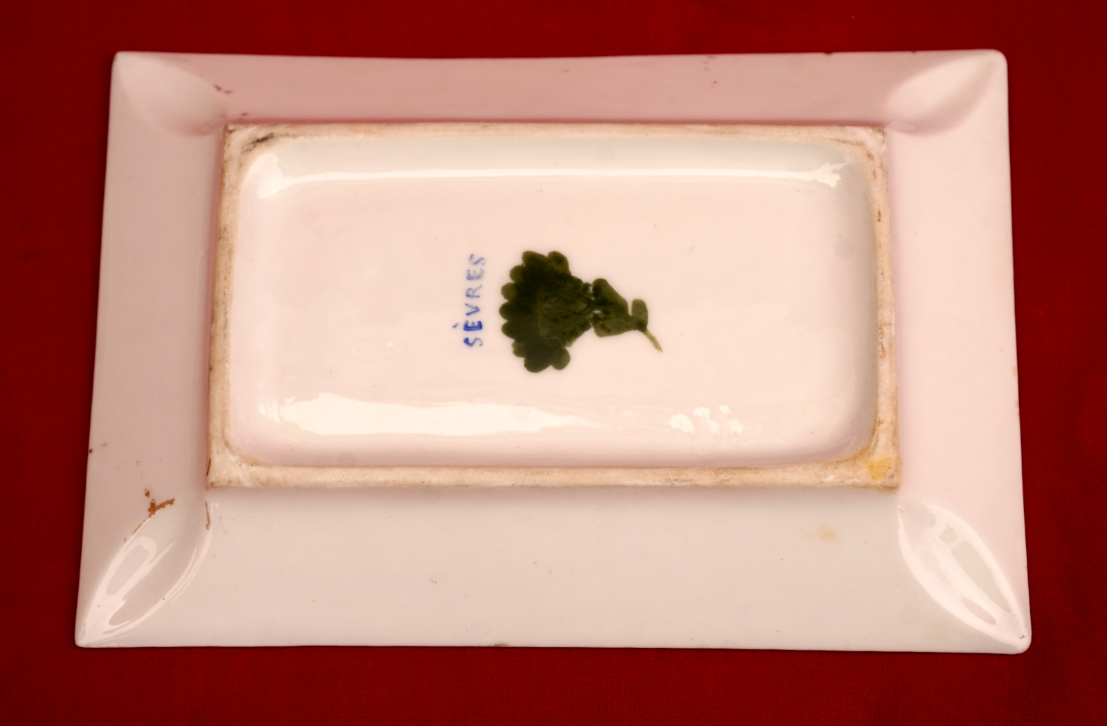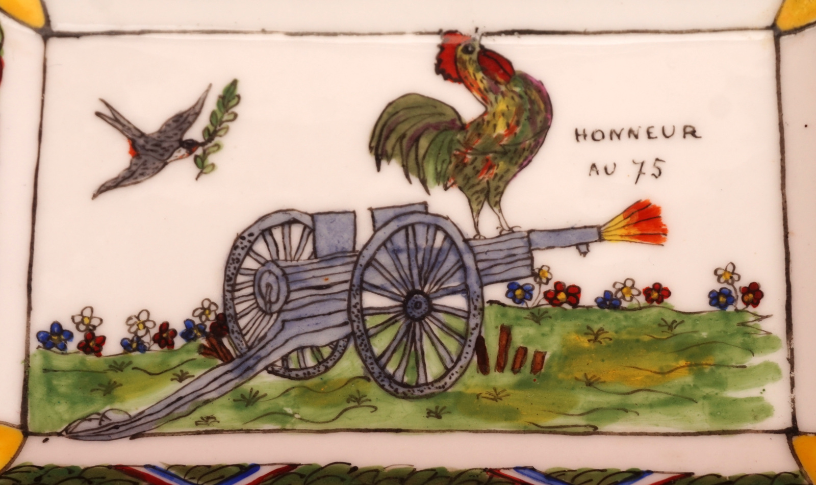 French hand painted porcelain commemorative tidy showing rooster and field and the motto Honor to the 75 made during the 1930's. It's signed on the back. 5" (12.7cm) by 3 1/2" (8.8cm). Perfect condition.
